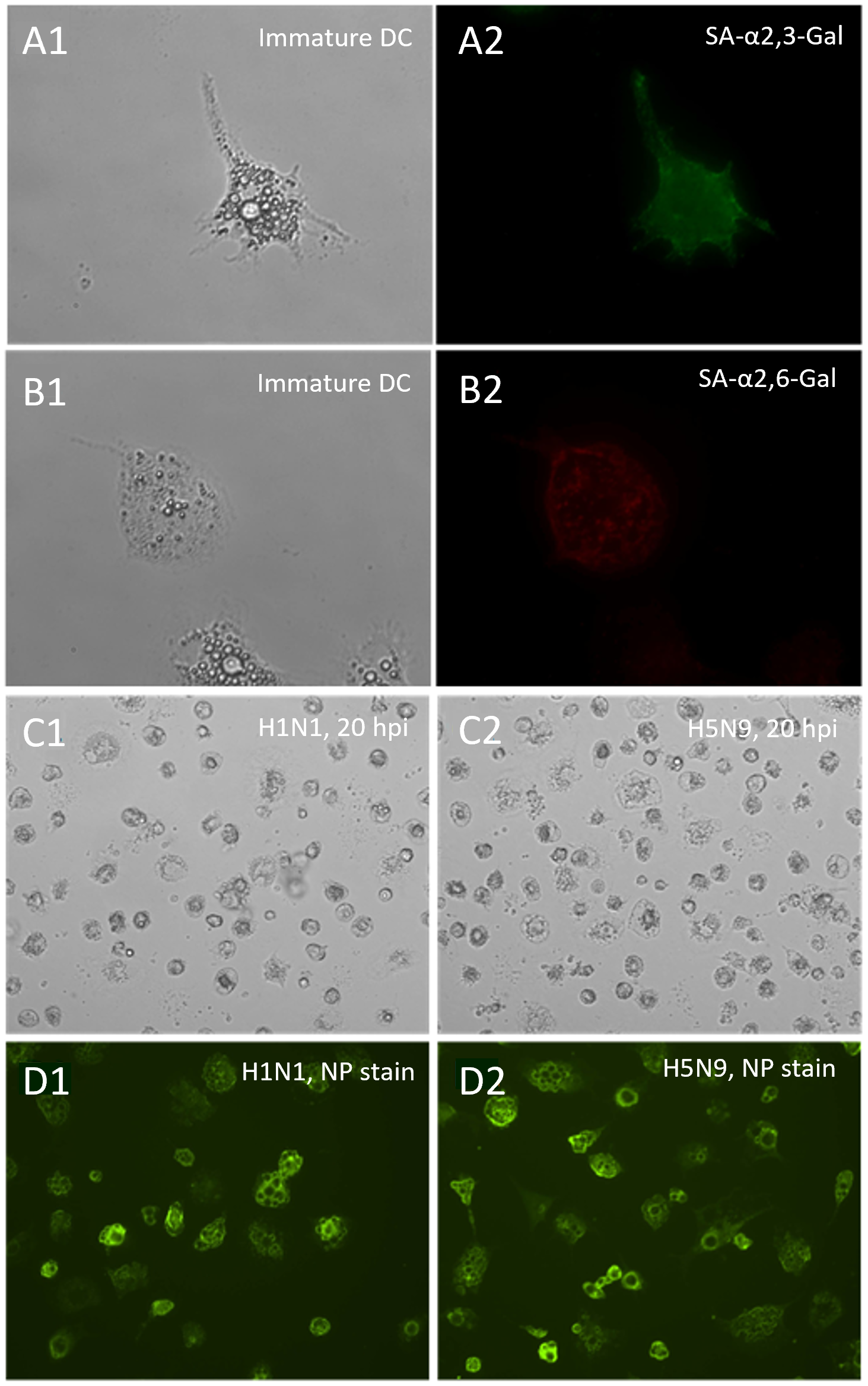 Distribution of sialic acid receptors on ckBM-DCs and susceptibility to pandemic H1N1 and H5N9 viruses. Cells were cultured in the presence of 50 ng/ml GM-CSF + 50 ng/ml IL-4 for 6 days. Immature ckBM-DCs (A1, B1) were stained with FITC-labeled MAA (SA-α2,3-Gal) (A2) or TRITC-labeled SNA (SA-α2,6-Gal) (B2) and visualized by immunofluorescence microscopy. CkBM-DCs were infected at an MOI of 1 with A/turkey/Virginia/SEP-4/2009 H1N1 (SA-α2,6-Gal preference) and A/turkey/Wisconsin/68 H5N9 (SA-α2,3-Gal preference). At 20 hpi, viral-infected cells, H1N1 (C1) and H5N9 (C2), were washed 2x with 1X PBS, fixed with methanol, and observed by microscopy. Viral NP proteins, H1N1 (D1) and H5N9 (D2), were detected using a mouse-anti-NP antibody followed by a FITC-conjugated anti-mouse IgG secondary (D1,D2). A representative image is shown for each at 200x (A1,A2,B1,B2) and 100x (C1,C2,D1,D2) magnification.