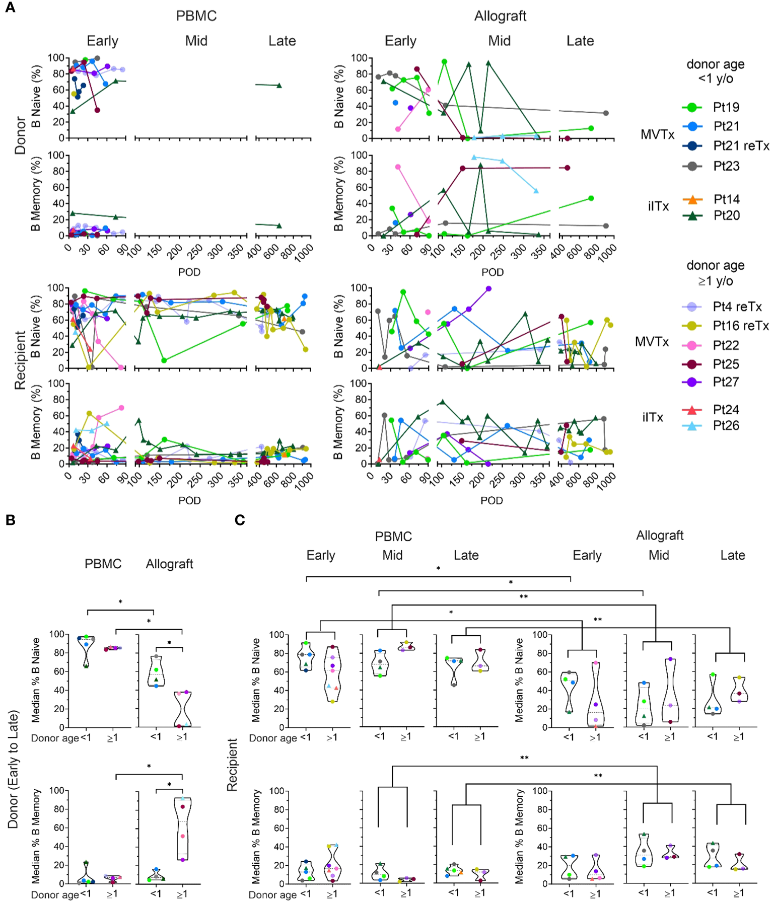 To further characterize B cell populations after ITx, we used multicolor flow cytometry to identify naïve (CD27-IgD+) and memory (CD27+IgD+/-) subsets among recipient and donor B cells (Supplementary Figures 1, 2). From the early to the late post-Tx period, donor B cells in the PBMC were mainly naïve. Percentages of naïve cells among donor B cells were generally higher in peripheral blood than in the allograft (Figures 2A, B). Within the allograft, younger donors (<1 year old) showed significantly higher proportions of naïve B cells and significantly lower levels of memory B cells compared to older donors (≥1 year old) (Figure 2B), demonstrating B cell maturation in the human gut after infancy.