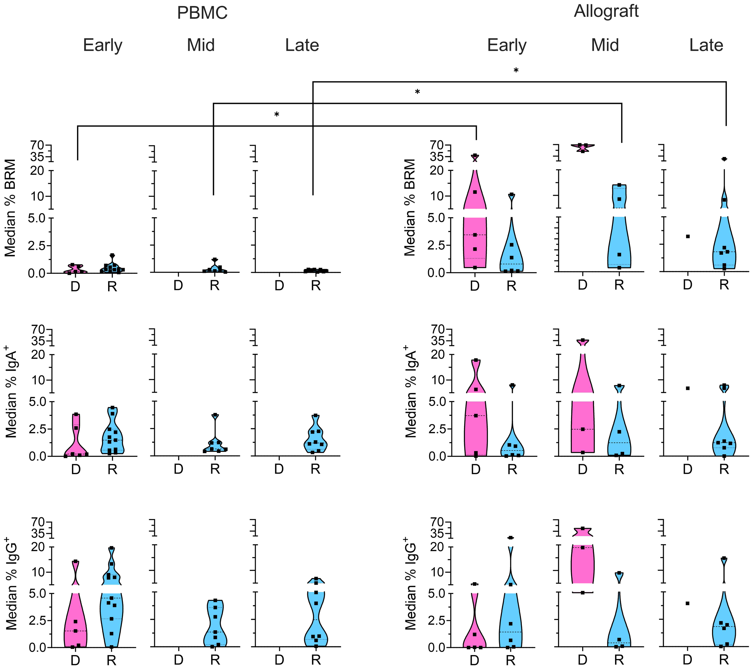 Memory subsets in donor and recipient B cells. Median percentages of donor (“D”: pink) and recipient (“R”: blue) BRM cells (CD69+CD45RB+), IgA+, and IgG+ B cells from the CD24+ memory gate (Supplementary Figure 1) within total recipient B cells for each patient in the PBMC and ileal allograft during early, mid and late post-Tx periods. In all cases, only quiescent samples exceeding a 40 cell threshold in the preceding parent gate are shown. Low sample numbers in the late time bracket for donor cells reflect near-complete replacement by recipient B cells at this stage. Dashed lines from the bottom to the top within each condition represent the first quartile, median, and third quartile of data distribution, respectively. The Mann-Whitney U test was performed to determine statistical significance (*p<0.05).