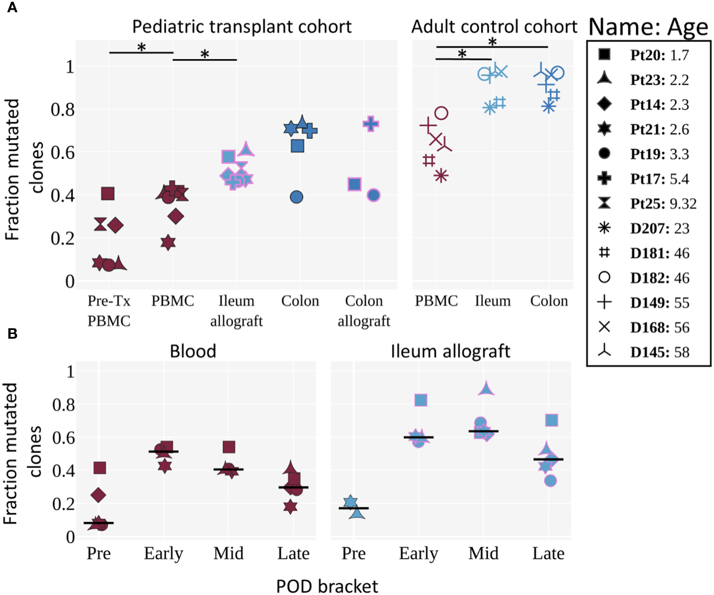 Mutation levels of BCR clones in pre- and post-Tx samples of pediatric ITx patients and adult deceased donor controls. (A) Fraction of mutated clones (clones with an average v gene mutation frequency >2%) by tissue for pediatric Tx patients and adult controls (11). Each individual is represented by a unique marker. The color of the marker represents the tissue, and the pink marker outline indicates that the tissue is an allograft. Tissues from the pediatric cohort are post-Tx unless specifically labeled as pre-Tx. Ages are shown in years. The Wilcoxon two-sided paired test was used to test for significance when the categories being compared were from the same cohort. An asterisk (*) denotes p-values <0.05. (B) Fraction of clones with an average v gene mutation frequency >2% by POD bracket for blood and ileum allograft (or native ileum for the “Pre” time bracket). Each POD is grouped into either pre, early, mid, or late time brackets (POD0, POD1–90, POD91–365 and POD>365, respectively). For each individual, the median among samples at a given POD bracket is shown. The horizontal black line represents the median among the individuals. POD samples were filtered for having >5 clones. Tissues are colored as in Figure 4A. (A, B) Pre-Tx samples represent native recipient blood/tissue and were taken during transplantation. Comparisons performed here were based on previous knowledge obtained in the adult control cohort and to determine: 1) whether tissue differs from blood in B cell mutation levels; and 2) whether mutation levels of circulating and ileal allograft B cells increase post-transplant. Our significance level is α = 0.05.