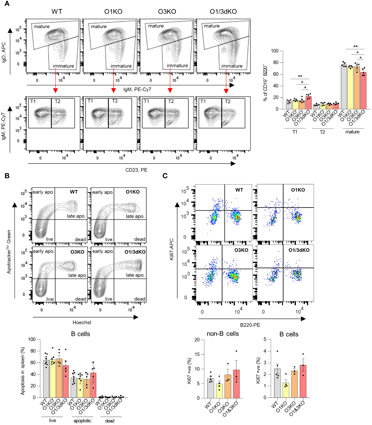 Though we did not detect defects in early B cell development in the BM of O1/3dKO mice, we did note a high population of immature B cells. B cells are involved in the development of autoimmune diseases through their interaction with T lymphocytes and their potential to produce autoantibodies (41). Immature transitional B cells actively exert immunomodulatory functions through the production of cytokines, thereby influencing both, T cell responses and the fate of autoreactive B cells (53). Abnormal distributions of various transitional B cell subsets have been identified in patients with autoimmune diseases (54). Patients with SLE have been found to have increased numbers of circulating T1 B cells (55). In our study, we observed elevated numbers of T1 B cells in the spleens of O1/3dKO mice, a characteristic, which may potentially predispose to autoimmune diseases.