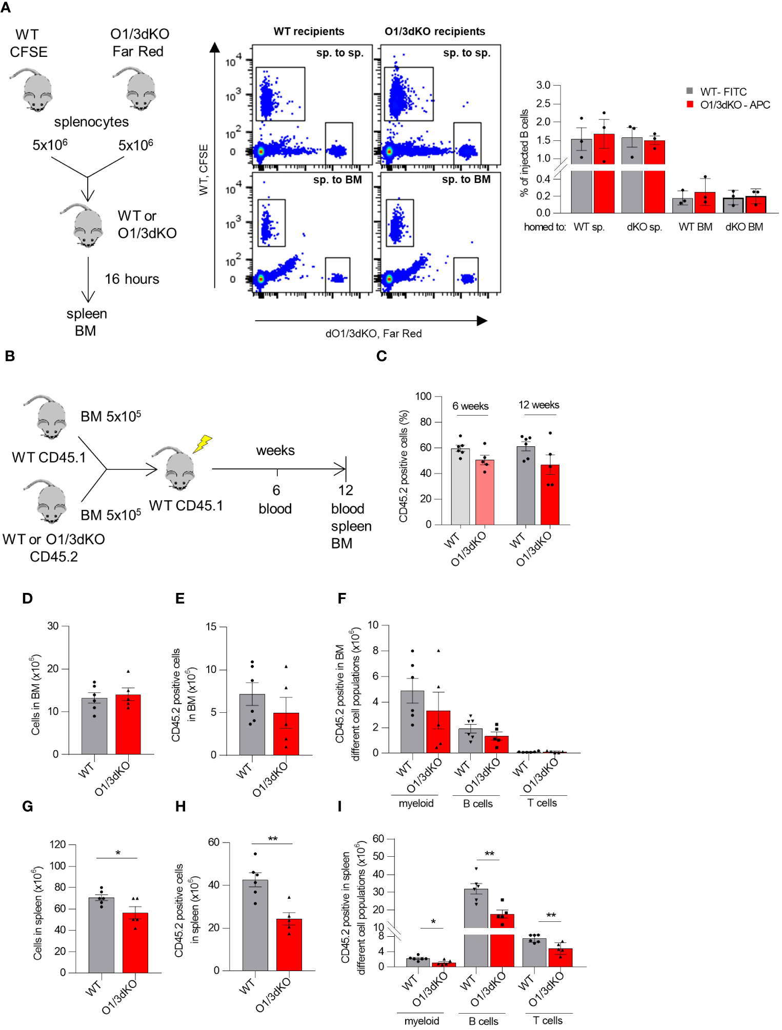 Single cell suspensions of WT and O1/3dKO splenocytes were prepared as described above. Cells were labeled with CellTrace™ CFSE or Far Red, respectively (Invitrogen) according to the manufacturer´s instructions. Cells were washed and mixed in 1:1 ratio (5x106 cells of each cell type) in 150 μl of sterile PBS. Cell suspensions were injected into tail veins of recipient mice (WT or O1/3dKO). Mice were sacrificed 24 hours later and cells were isolated from the spleens and BM. Single cell suspensions were labeled with fluorescently conjugated anti-B220 antibody to distinguish B cells and analyzed by flow cytometry for the presence of CellTrace-positive cells. The absolute number of homed cells in each organ was calculated based on frequencies of CellTrace-positive cells and organ cell counts.