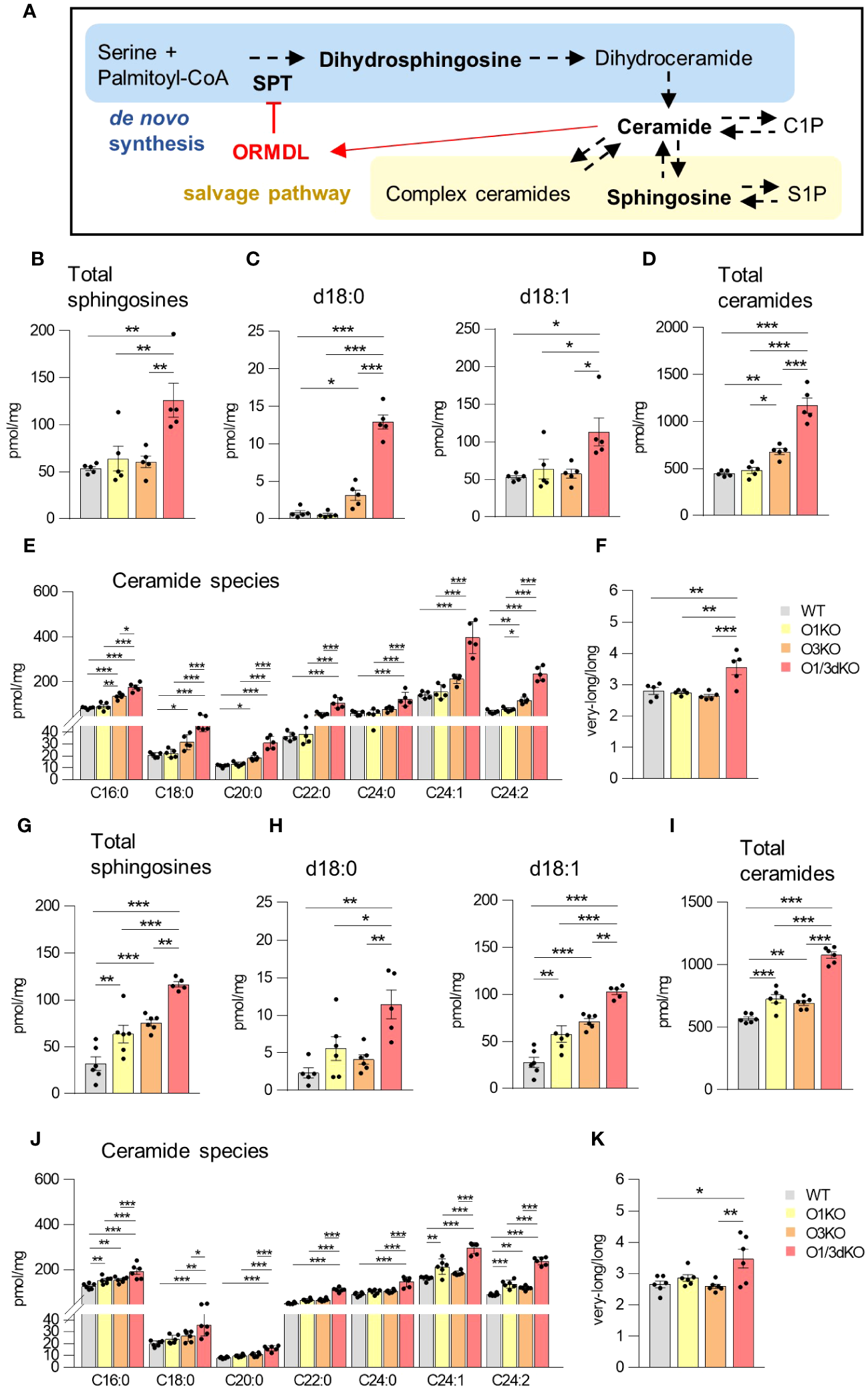 Increased sphingolipid production in the spleen and BM of O1/3dKO mice. (A) Schema of de novo sphingolipid biosynthesis (blue box) and sphingolipid salvage pathway (beige box) with the feedback inhibition by ORMDL proteins through sensing of elevated ceramide levels (red). SPT – serine palmitoyltransferase, CoA – coenzyme (A) Measured sphingolipids are in bold. LC-ESI-MS/MS analysis of sphingolipids in spleens (B–F) and BMs (G–K) of 6 to 8 week-old WT and O1/3dKO mice. (B, G) The sum of total sphingosines (d18:1, d18:0, d20:1, and d20:0). (C, H) Concentration of dihydrosphingosine (d18:0) and sphingosine (d18:1). (D, I) The sum of total ceramide derived from d18:1 sphingosine. (E, J) Levels of individual ceramide species with different fatty acid chains. (F, K) Ratio of very-long (C22-C26) vs. long (C14-C20) acyl chain ceramide molecular species. Data were analyzed by one-way ANOVA with Tukey´s post-test. (*P < 0.05, **P < 0.01 and ***P < 0.001). Each dot represents independent biological replicate. WT, Ormdl1-/- (O1KO), Ormdl3-/- (O3KO), Ormdl1-/-/Ormdl3-/- (O1/3dKO).
