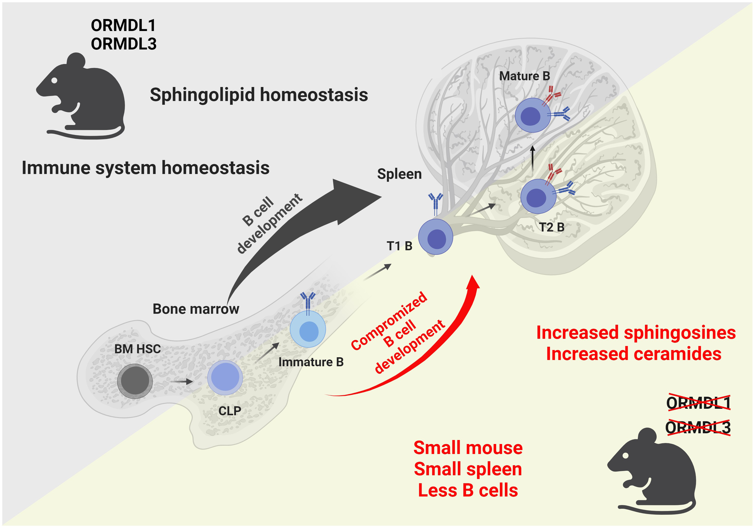 Graphical summary of the findings observed in mice with simultaneous deletions of ORMDL1 and ORMDL3 proteins. WT mice, depicted in the upper triangle, maintain sphingolipid homeostasis and normal B cell development within the bone marrow and spleen. Mice with double deletions of the sphingolipid biosynthesis regulators ORMDL1 and ORMDL3, depicted in the lower triangle, present with a significant pathological phenotype. O1/3dKO mice are smaller in stature. Furthermore, these mice have disproportionally smaller spleens with reduced splenocyte numbers and compromised B cell development that is characterized by increased proportions of T1 B cells in the spleen with decreased circulating mature B cells. Dysregulated sphingolipid biosynthesis leads to increased sphingosines and ceramides in both, the BM and spleens of O1/3dKO mice. BM HSC, bone marrow hematopoietic stem cells; CLP, common lymphoid progenitor cells; Immature B, Immature B cells; T1 B, Transitional 1 B cells; T2 B, Transitional 2 B cells; Mature B, Mature B cells. Created with BioRender.com.