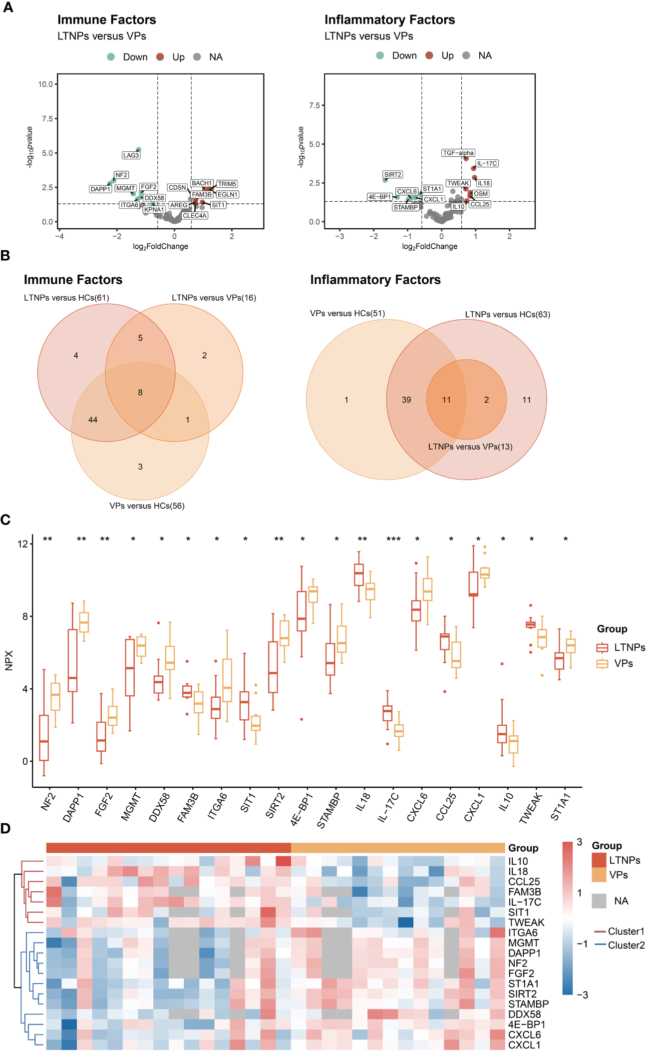 Figure 2 All differentially expressed immune and inflammatory factors between LTNPs and VPs. (A) Volcano plot depicting the expression levels of immune and inflammatory factors between LTNPs and VPs. In the left panel representing immune factors, red, green, and grey dots denote up-regulated, down-regulated, and non-significant differences, respectively, including LTNPs (n = 13) and VPs (n = 11). The right panel represents inflammation factors, including LTNPs (n = 16) and VPs (n = 14). (B) Venn plots of the differentially expressed immune and inflammatory factors between LTNPs and VPs. (C) Box plots comparing DEPs (LTNPs vs VPs) are expressed in Mean ± SD; NPX stands for Normalized Protein Expression. * p < 0.05, ** p < 0.01 and *** p < 0.001. (D) Heatmap of unsupervised clustering of DEPs between LTNPs and VPs. Proteins under the red or blue clustering tree are defined as Cluster1 and Cluster2, respectively.