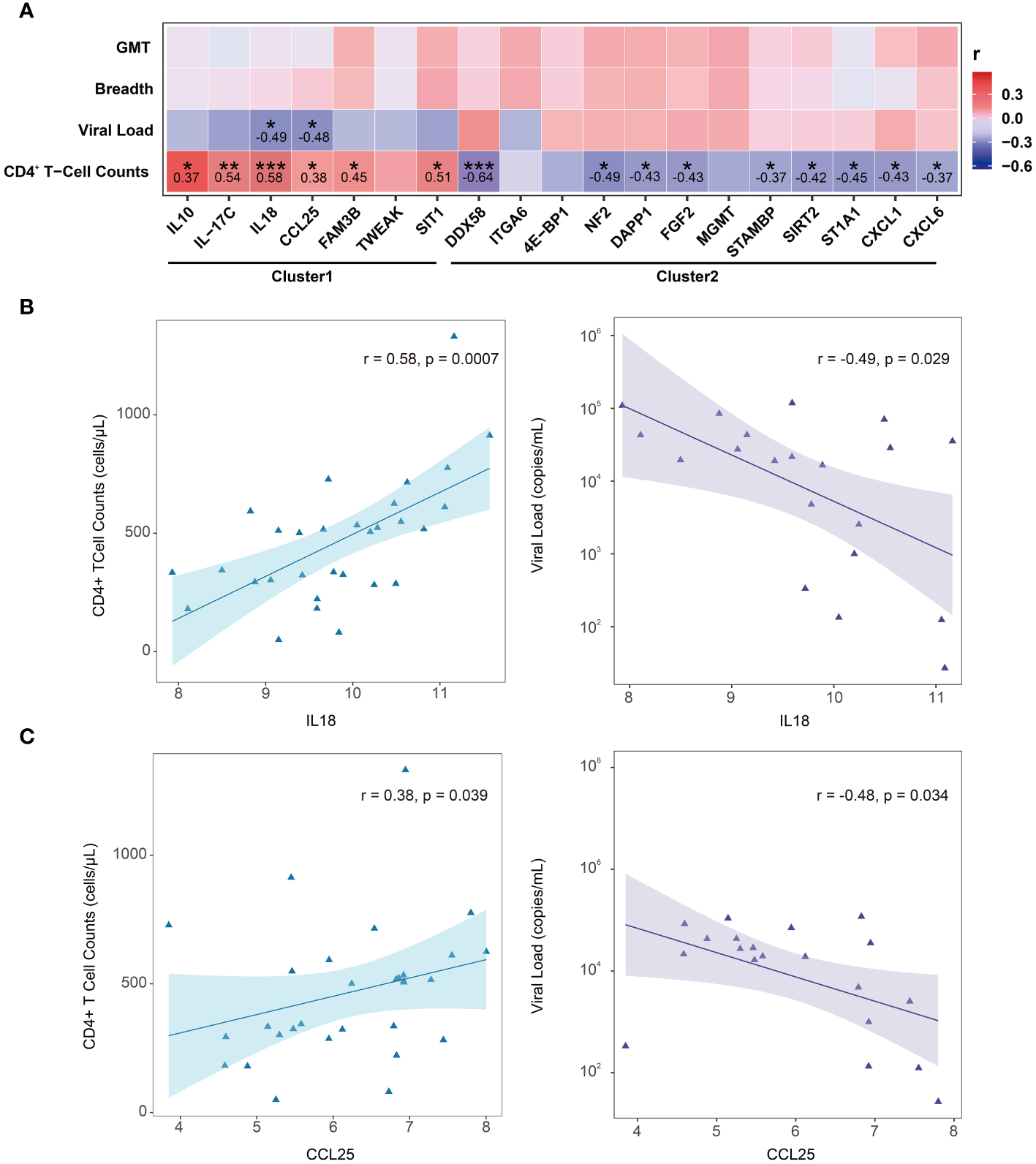 Figure 5 Correlation between DEPs (LTNPs vs. VPs) expression and clinical indicators. (A) Heatmap shows Spearman’s correlation between the expressions of DEPs (LTNPs vs. VPs) and clinical immunological indicators. * p < 0.05, ** p < 0.01 and *** p < 0.001. (B) The left panel shows a significant positive correlation between IL-18 and CD4+ T-cell counts, and the right panel shows a significant negative correlation between IL18 and viral load. (C) The left panel presents a significant positive correlation between CCL25 and CD4+ T-cell counts, and the right panel displays a significant negative correlation between CCL25 and viral load.