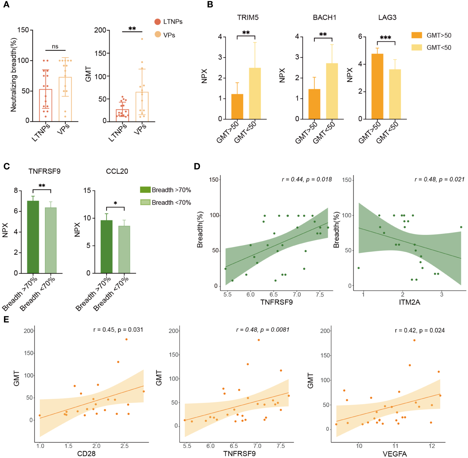 Figure 6 Analysis of biomarkers associated with plasma neutralizing activity. (A) Comparison of plasma neutralization breadth and GMT between LTNPs and VPs. (B) Bar plots show TRIM5, BACH1 and LAG3 expression levels. (C) Bar plots show TNFRSF9 and CCL20 expression levels in the two neutralization breadth groups. (D) Correlation of TNFRSF9 or ITM2A expression level (NPX) with neutralization breadth. (E) Correlation of CD28, TNFRSF9 and VEGFA expression levels (NPX) with GMT. * p < 0.05, ** p < 0.01, *** p < 0.001 and ns stands for non-significance.
