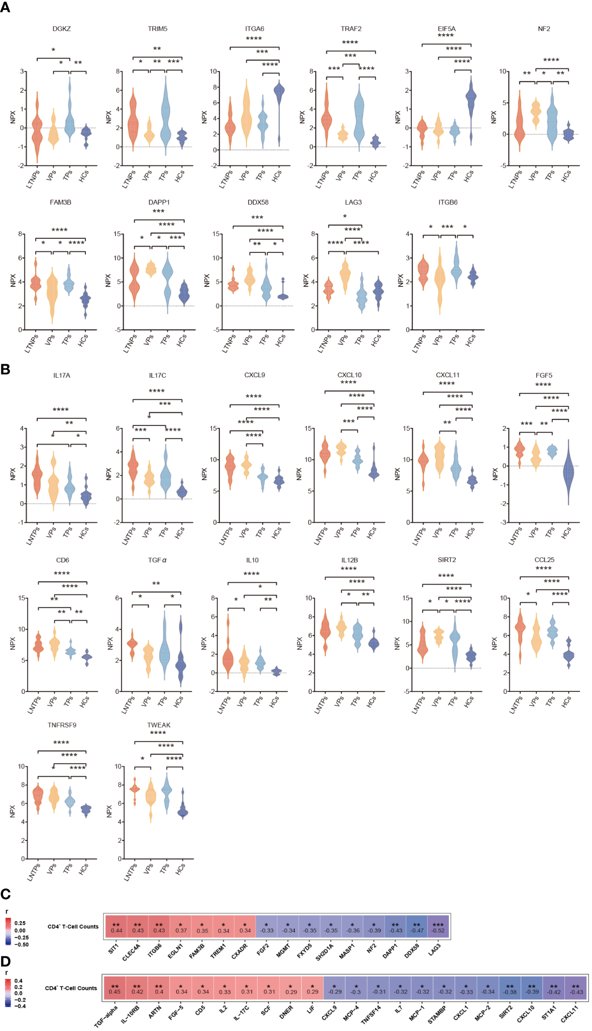 Figure 7 Differential analysis of the immune and inflammatory factors expression levels between the four groups. (A) Violin plots of the immune factors between the four groups, including LTNPs (n=13), VPs (n=11), TPs (n=16), and HCs (n=15). (B) Violin plots of the inflammatory factors between the four groups, including LTNPs (n=16), VPs (n=14), TPs (n=16), and HCs (n=15). (C) Heatmap shows the Spearman correlation between immune factors expression levels (NPX) and CD4+ T-cell counts. (D) Heatmap shows the Spearman correlation between inflammatory factors expression levels (NPX) and CD4+ T-cell counts. One-way ANOVA is used to evaluate the statistical difference of factors between the four groups. * p < 0.05, ** p < 0.01, *** p < 0.001 and **** p < 0.0001.