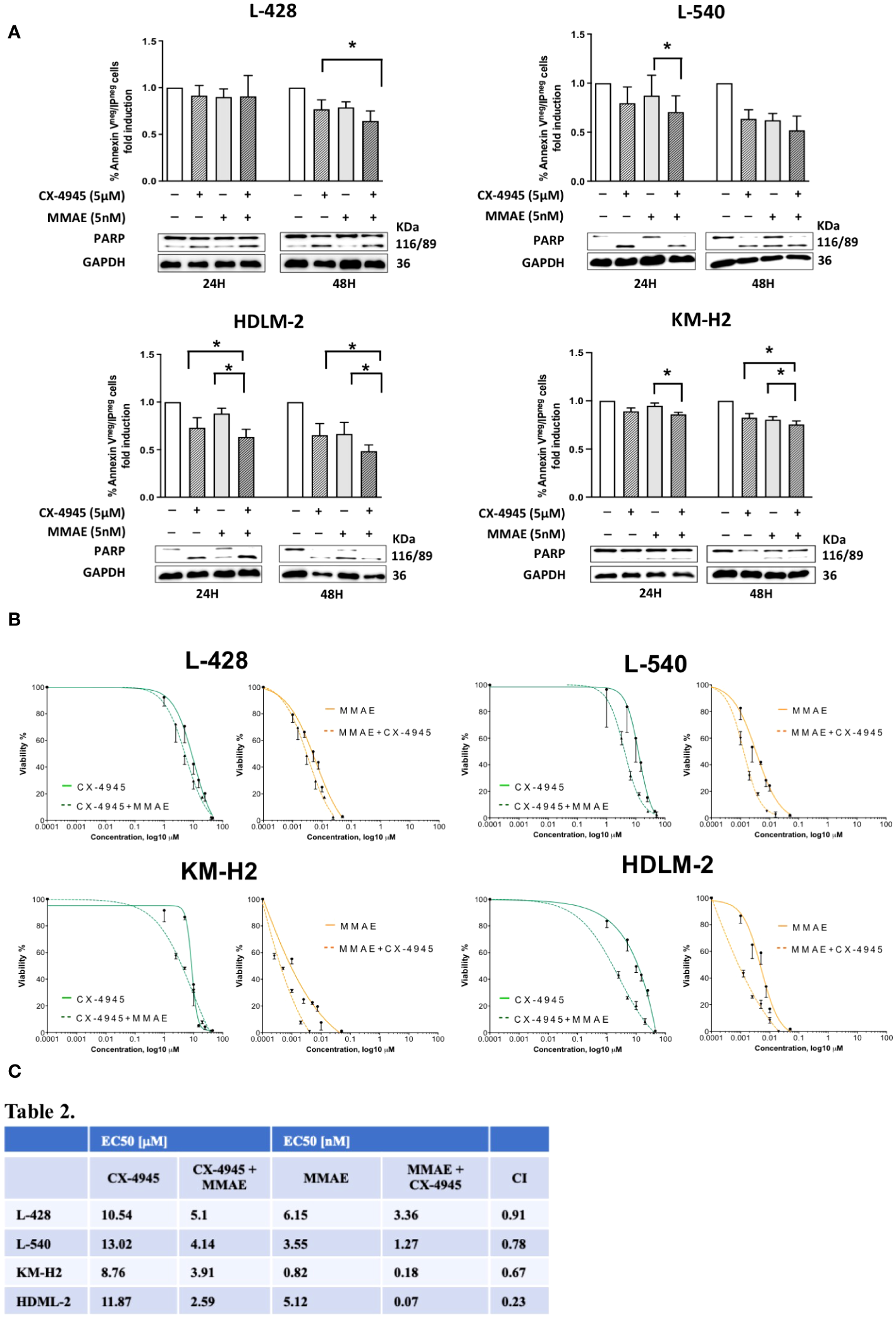 Apoptotic effect of CX-4945 alone or in combination with MMAE in Hodgkin lymphoma cell lines. HL cells lines were treated for 24 and 48 hours with CX-4945 and/or MMAE or the combination of both drugs. Apoptosis was detected through Annexin V propidium iodide (PI) assay by flow cytometry. Histograms shows alive non-apoptotic cells (Annexin Vneg/PIneg). Wilcoxon matched-pairs signed rank test was used to compared paired data (A). A qualitative WB (n=2), placed beneath each histogram, shows the cleavage of PARP protein expression in response to the heightened levels of apoptosis induced by the pharmacological treatments. In the middle panel (B) dose response curves of L-428, L-540, KM-H2, and HDLM-2 cell lines incubated for 72h with increasing concentrations of CX-4945 (green curves), and MMAE (orange curves) or their combination (dotted curves) are reported. Cell viability was assessed by trypan-blue exclusion assay. The curves were generated by maintaining a constant 1:1 ratio between the respective EC50 concentrations of CX-4945 and MMAE. In the lower panel (C), EC50 values of CX-4945 and MMAE, used alone or in combination in L-428, L-540, KM-H2, and HDLM-2 cell lines incubated as in (B). A combination index (CI) < 1 means a synergistic effect. Experiments were performed in triplicate. *p<0.05. Wilcoxon matched-pairs signed rank test.