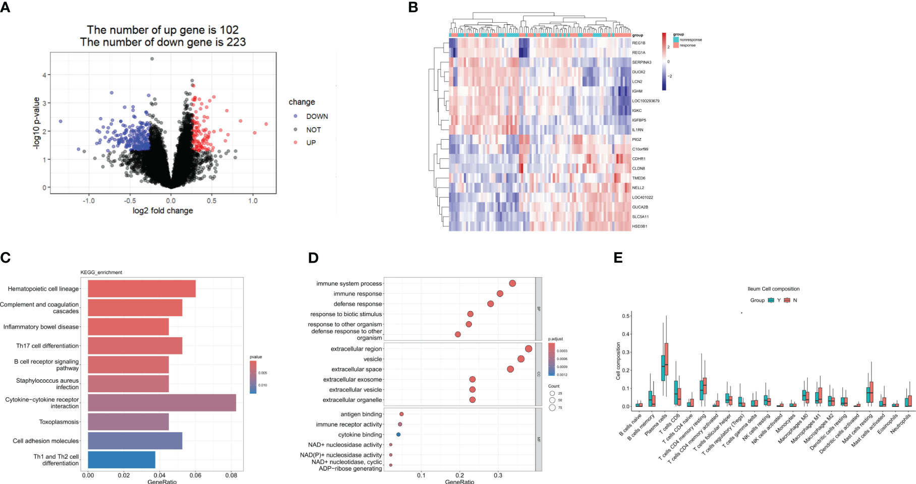 DEGs in the response group compared to the nonresponse group in the ileum at week 0. (A) A volcanic map of the DEGs in GSE112366. (B) A heatmap of the top 10 upregulated and the top 10 downregulated DEGs. (C) The KEGG analysis. (D) The top 10 functional enrichment in BP, CC, and MF analysis. (E) Differences in immune cell infiltration between the response group and the non-response group. Y: response, N: non-response. DEGs, differentially expressed genes; KEGG, Kyoto Encyclopedia of Genes and Genomes. Wilcoxon tests were used for statistics. *p < 0.05.