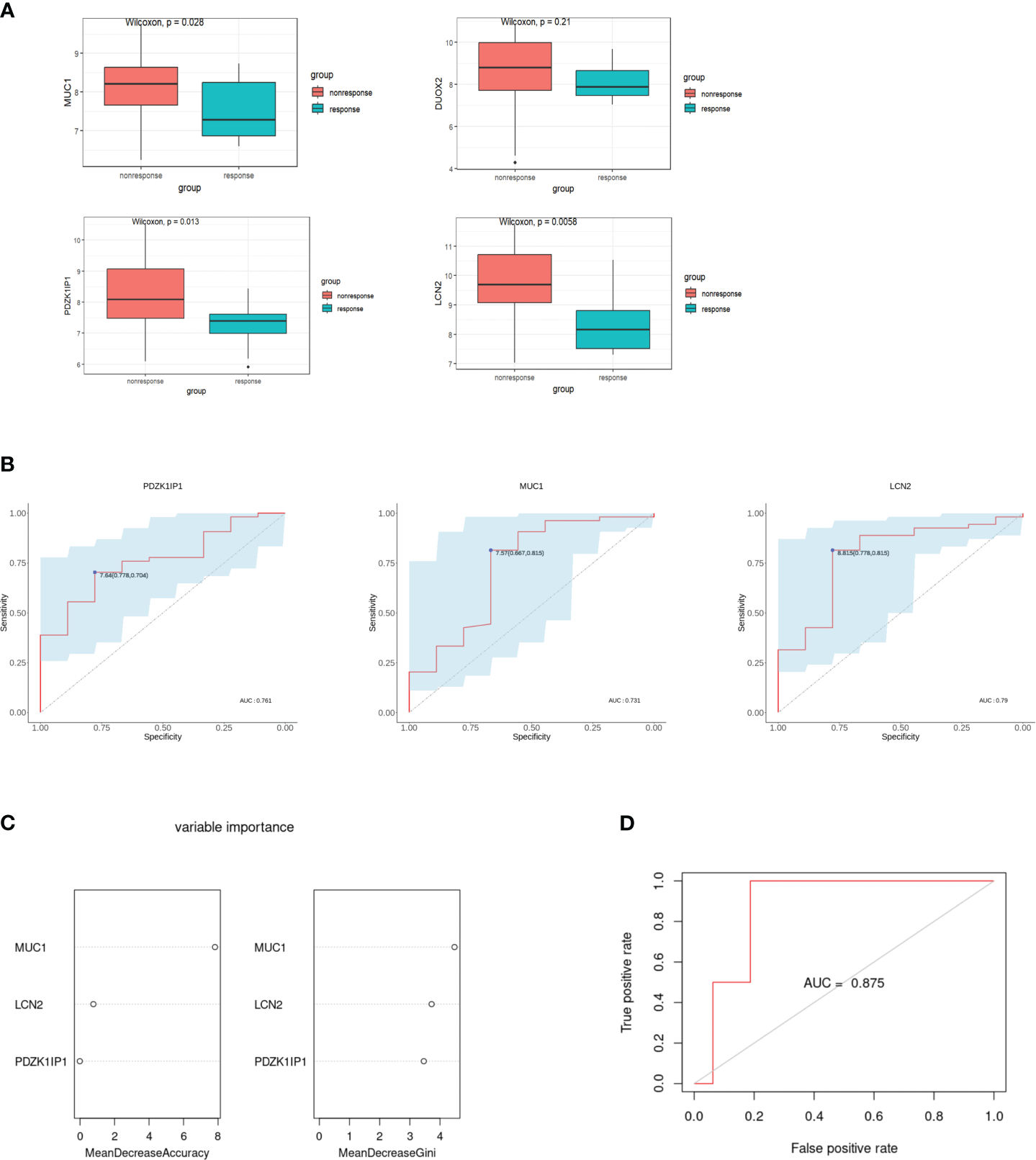 Verification of hub genes and establishment of the random forest model. (A) Comparison of the expression of hub genes in the GSE207022 dataset between the response and the non-response group. (B) The area under ROC curve indicates the effectiveness of the hub genes in prediction of treatment response to ustekinumab in the GSE207022 dataset. (C) Relative importance of all features in the current study based on mean decrease in accuracy (left) and mean decrease in Gini index (right) in the GSE207022 dataset. (D) The ROC plot for the random forest model in the GSE207022 dataset, AUROC is 0.875.