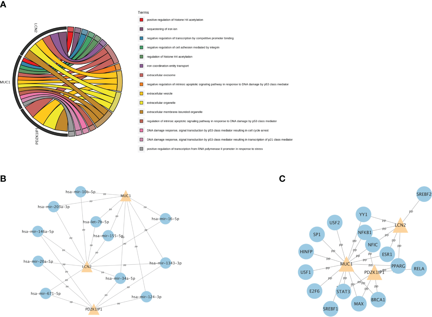 Then, we explored the function of these three hub genes. GO analysis showed that MUC1 is mainly enriched in DNA damage and repair, LCN2 is mainly enriched in iron metabolism, and they are all enriched in extracellular membrane-bounded organelle (Figure 6A).