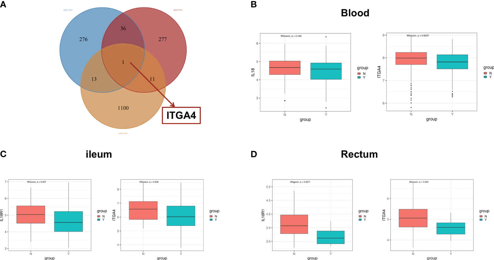 The co-expression genes in ileal and blood samples. (A) The Venn diagram of overlapping DEG genes among the GSE112366, GSE207022, and GSE207465 datasets. The difference of the expression of ITGA4 and IL18R1 between the response group and the nonresponse group in the blood (B), ileum (C), and rectum (D). DEGs, differentially expressed genes; Y: response, N: non-response.