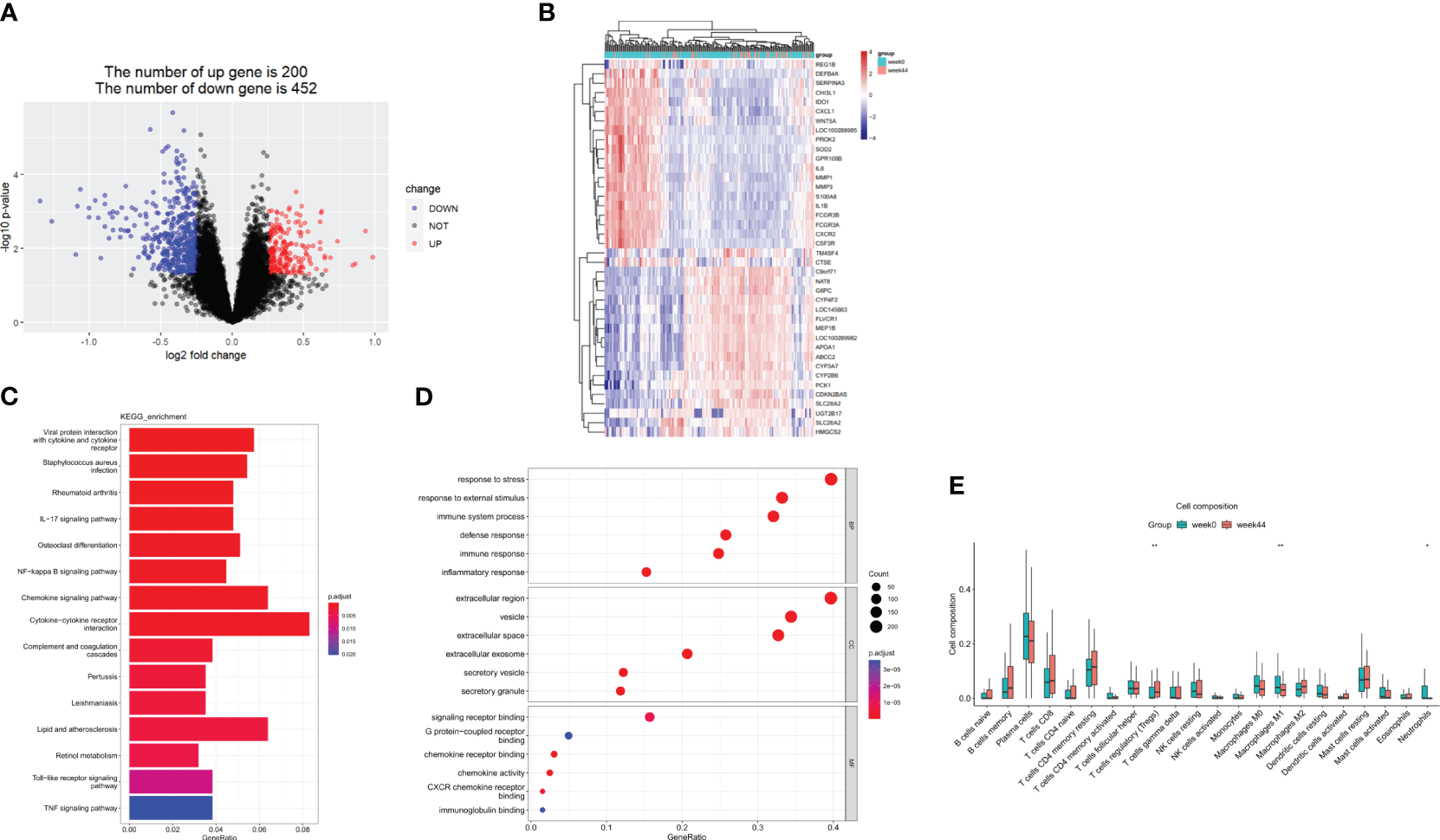 DEGs before and after ustekinumab treatment. (A) A volcanic map of the DEGs in the GSE112366 dataset. (B) A heatmap of the top 40 DEGs. (C) The KEGG analysis. (D) The GO enrichment analysis of DEGs in BP, CC, and MF. (E) The estimation of the infiltration of immune cells using the CIBERSORT algorithm. Wilcoxon tests were used for statistics. *p <0.05, **p < 0.01. DEGs, differentially expressed genes; GO, Gene Ontology; KEGG, Kyoto Encyclopedia of Genes and Genomes.