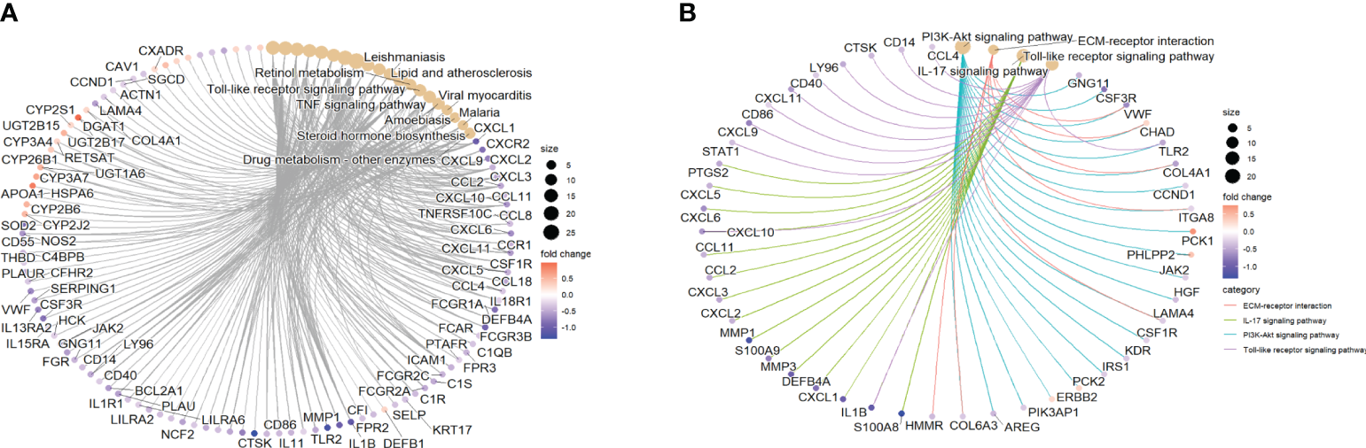 (A) The top 10 pathways from KEGG analysis and the genes enriched in the pathways are visualized. (B) The fibrosis-related pathways with significant changes and the genes enriched in the pathways are visualized. KEGG, Kyoto Encyclopedia of Genes and Genomes.