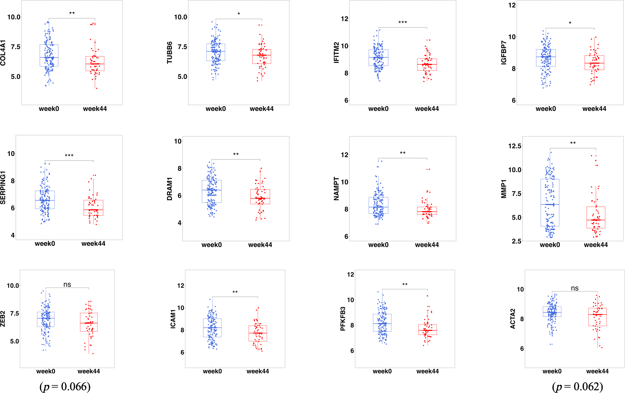 The fibrosis-related DEGs before (week 0) and after treatment (week 44) with ustekinumab. DEGs, differentially expressed genes. *p < 0.05; **p < 0.01; ***p < 0.001; ns, not significant.