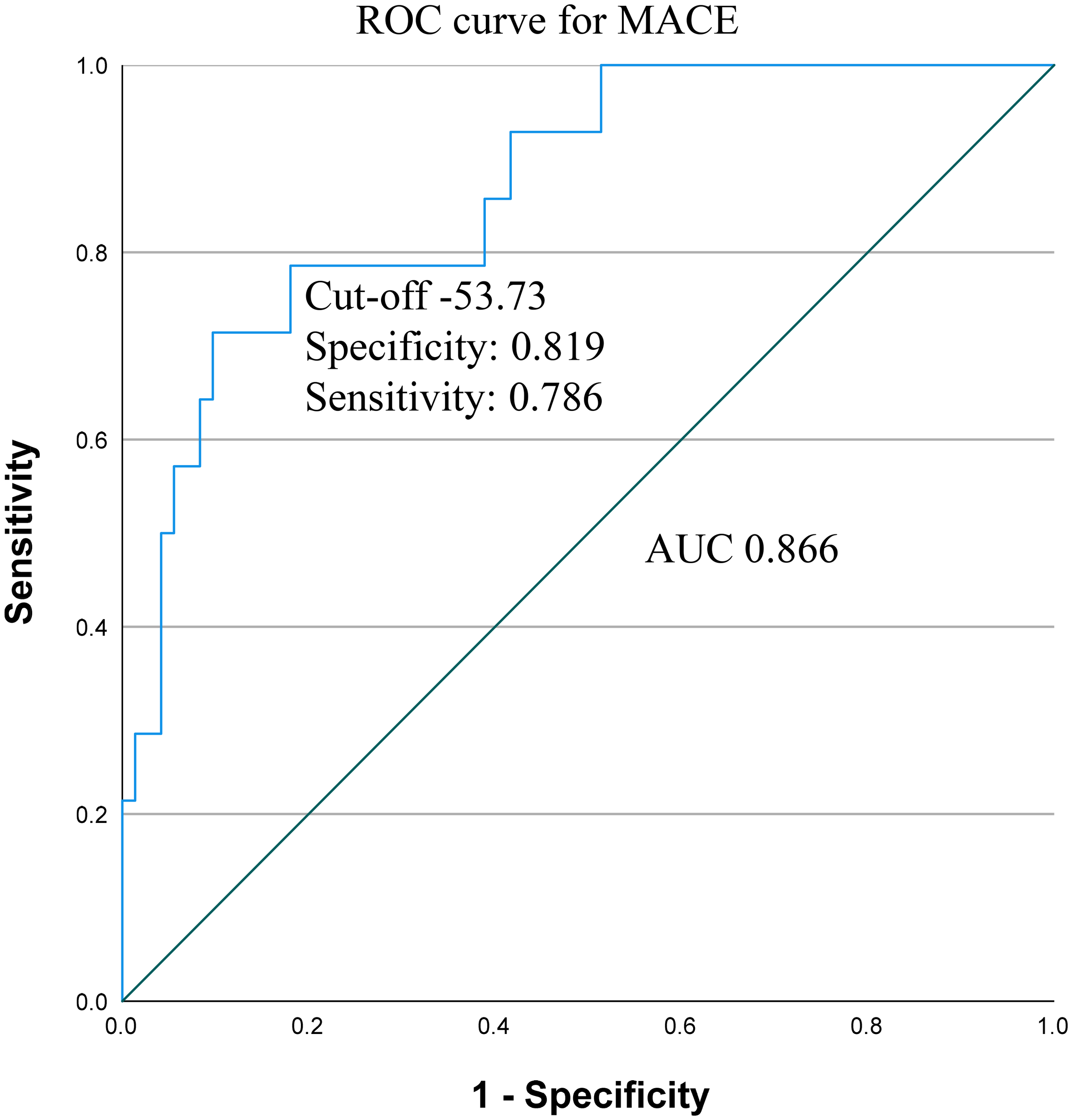 Figure 5 Receiver operating characteristic (ROC) curve and area under the curve (AUC) with cut-off value, sensitivity and specificity for CANDE score predicting MACE. MACE, major adverse cardiovascular event.