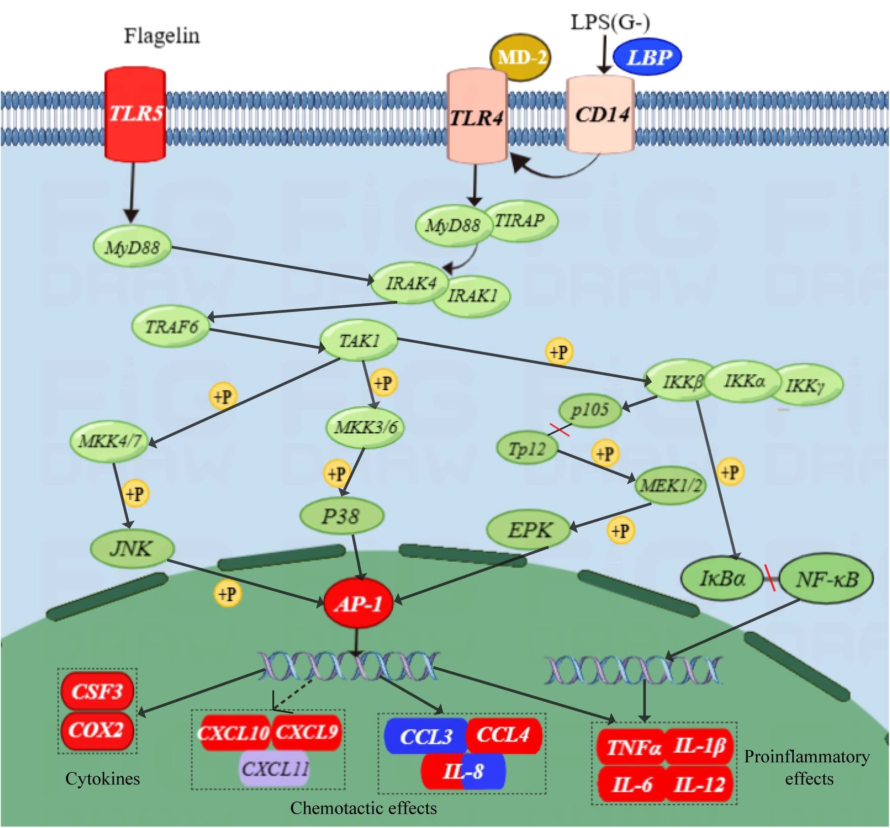Figure 6 Schematic of TLR signaling pathway. Red indicates upward adjustment, blue indicates downward adjustment, and other colors indicate no significant change. Solid arrows indicate direct action, dotted arrows indicate indirect action; +P means phosphorylation.