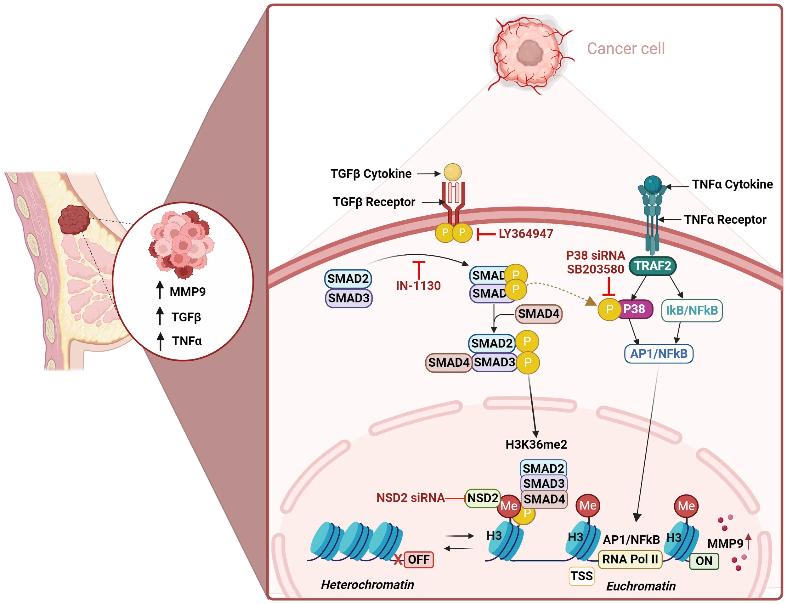 histone methylation, H3K36me2, MMP-9, Smad2/3, TNF-α, TGF-β, Breast cancer