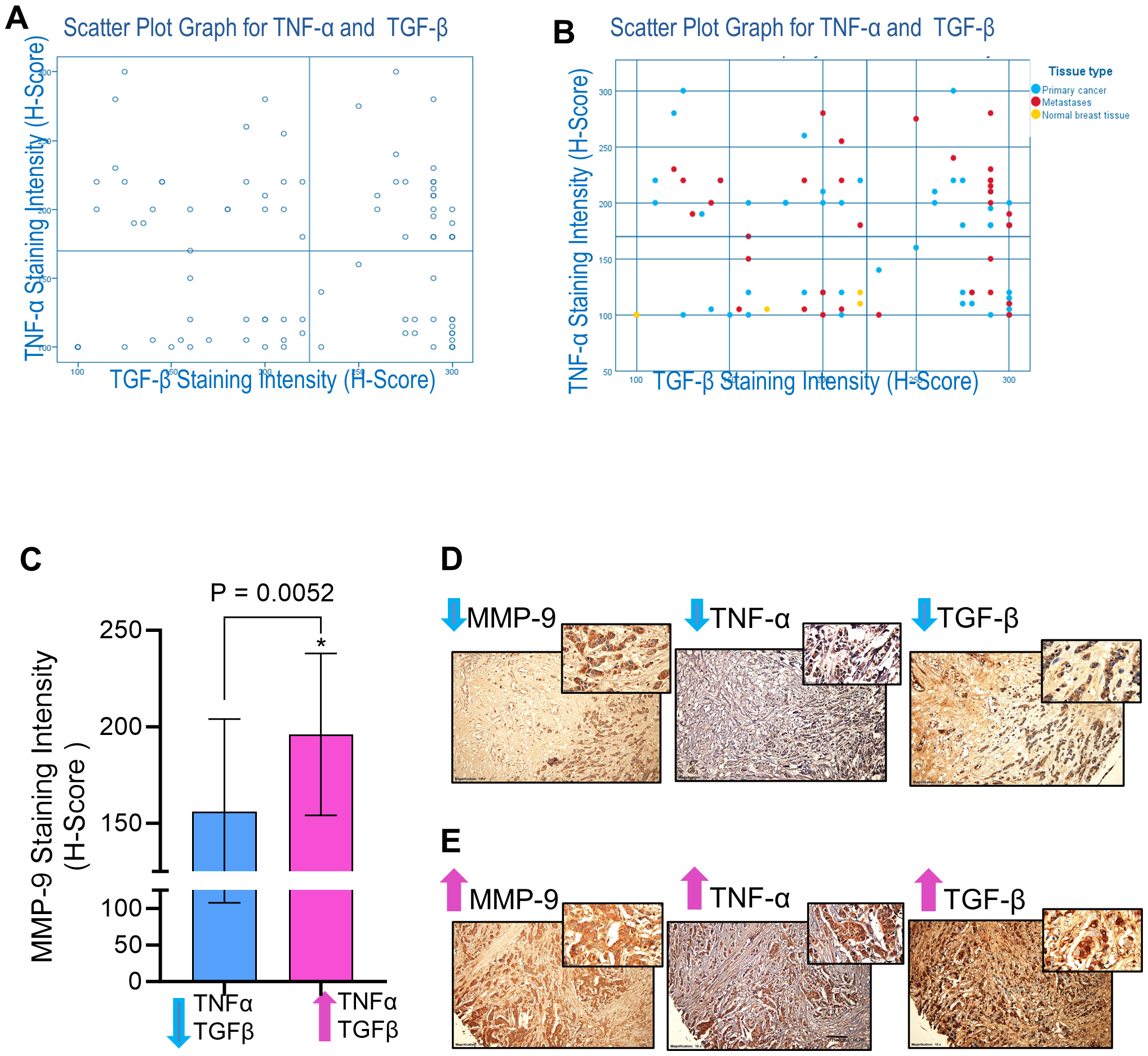MMP-9 expression is associated with TGF-β and TNF-α in breast cancer tissues. Immunohistochemical staining was done for MMP-9, TGF-β, and TNF-α expressions. Tissue microarray TMA slides (88 breast cancer tissues from breast cancer patients) were subjected to immunohistochemistry using antibodies against MMP-9, TGF-β, and TNF-α. Based on IHC staining intensities of TGF-β and TNF-α, patients’ samples were divided into four groups (Low TNF-α- Low TGF-β; Low TNF-α- High TGF-β; High TNF-α- Low TGF-β; High TNF-α- High TGF-β. (A) Scatter Plot Graph for TNF-α and TGF-β. (B) Scatter Plot Graph for TNF-α and TGF-β with indication of patients with primary cancer, metastasis and normal breast cancer tissues. (C) MMP-9 expression was elevated in the breast cancer tissues (n=24 patients) having high levels of TGF-β and TNF-α compared to the tissues (n=20 patients) having less TGF-β and TNF-α. (D) Representative IHC images of the samples of breast cancer tissues with low levels of MMP-9, TGF-β and TNF-α. (E) Representative IHC images of the samples of breast cancer tissues showing high levels of MMP-9, TGF-β and TNF-α. All data is presented as the mean ± SD. *p < 0.05.