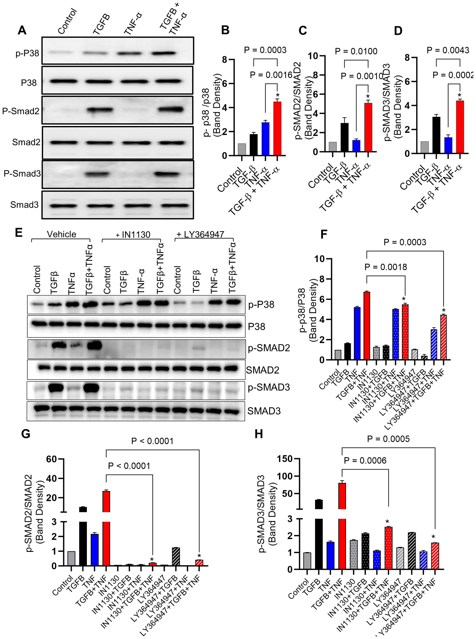 Combined treatment of TGF-β/TNF-α enhances p38 and Smad2/3 phosphorylation. (A) Cells were treated with vehicle, TGF-β, TNF-α or TGF-β/TNF-α and cell lysates were prepared and run on denaturing gel as described in the materials and methods section. Phosphorylated p38 and Smad2/3 are presented in the upper panels, while the lower panels exhibit the total respective proteins. (B–D) Calculations of the ratio between phosphorylated and total protein ratios were based on densitometry data, relative to the control. (E) Inhibitors blocking the TGF-β pathway lead to a reduction in p38 and SMAD2/3 phosphorylation induced by TGF-β/TNF-α. MDA-MB-231 cells were pretreated with SMAD2/3 (IN-1130; 10µM) and TGFβR (LY364947; 10µM) inhibitors for 1 h before being incubated with TGF-β, TNF-α, or TGF-β/TNF-α. The upper panels display phosphorylated p38 and SMAD2/3, while the lower panels exhibit the total corresponding proteins. (F–H) Densitometry data were used to calculate the ration between the phosphorylated and total protein ratios relative to the control. All data is presented as the mean ± SEM (n= 3). *p < 0.05.
