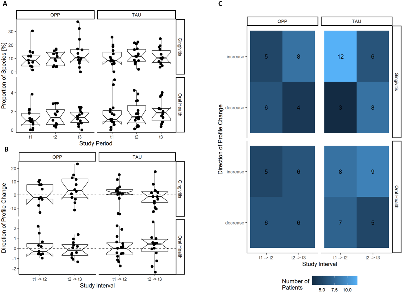 Figure 6. Development of the gingivitis and oral health cluster during OPP and TAU. No effect of the intervention on the development of the gingivitis or health cluster was found. (A) Gingivitis and oral health cluster per study time point. (B) Change in the gingivitis and health cluster per patient in the study intervals. (C) Frequency of the direction of change of the gingivitis and health cluster during the study. OPP, intensive oral prophylaxis program; TAU, treatment-as-usual.