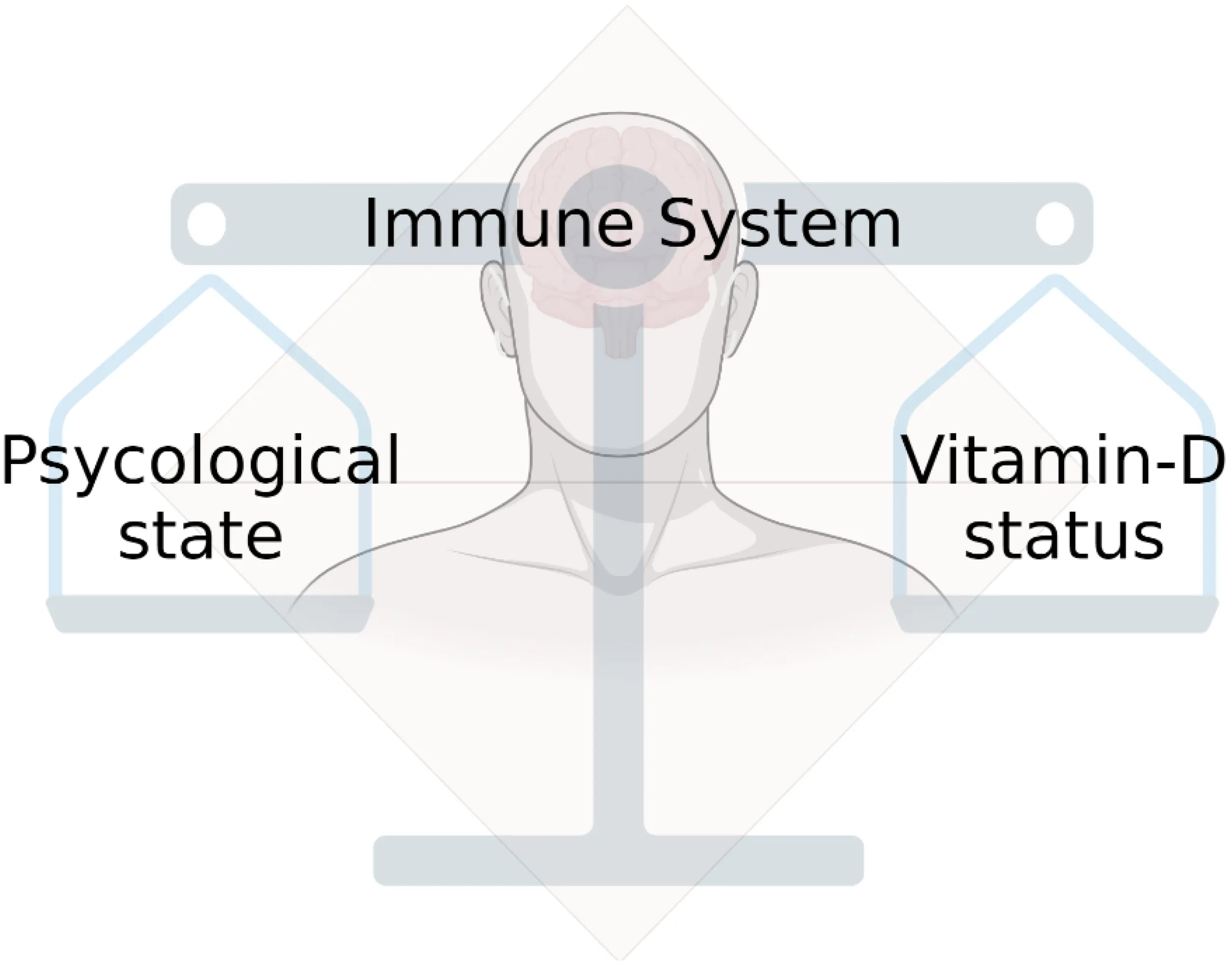 This figure illustrates that the balance of the immune system is influenced by the physical effects of vitamin D and the psychological effects of stress.