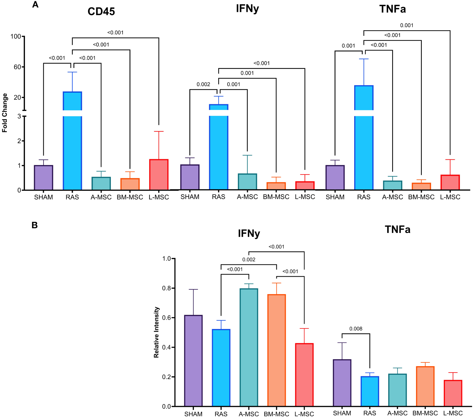 Untreated RAS mice had significantly higher gene expression of CD45 (27.8 ± 25.5 vs 1.02 ± 0.2 in sham, p< 0.001), IFNy (10.8 ± 10.3 vs 1.03 ± 0.27 in sham, p= 0.002), and TNFa (35.9 ± 34.4 vs 1 ± 0.2 in sham, p= 0.001). Treatment with MSC of all types resulted in decreased gene expression of CD45 (A-MSC: 0.55 ± 0.23; BM-MSC: 0.49 ± 0.26; L-MSC: 1.26 ± 1.12; all vs RAS, p< 0.001); IFNy (A-MSC: 0.67 ± 0.74; BM-MSC: 0.31 ± 0.21; L-MSC: 0.35 ± 0.28; all vs RAS, p≤ 0.001); and TNFa (A-MSC: 0.39 ± 0.17; BM-MSC: 0.30 ± 0.12; L-MSC: 0.63 ± 0.61; all vs RAS, p≤ 0.001) when compared to the untreated RAS group (Figure 3A). On western blot, the protein expression of IFNy was higher for A-MSC (0.8 ± 0.03 vs RAS, p< 0.001) and BM-MSC treated mice (0.76 ± 0.07 vs RAS, p= 0.002) compared to untreated RAS mice (0.52 ± 0.06). On the other hand, mice treated with L-MSC (0.43 ± 0.1) had lower protein expression of IFNy compared to A-MSC (p< 0.001) and BM-MSC (p< 0.001) and similar level of expression to the untreated RAS group. No significant differences were observed for TNFa protein expression among untreated and MSC-treated RAS mice (Figure 3B), but they were no longer lower than sham.