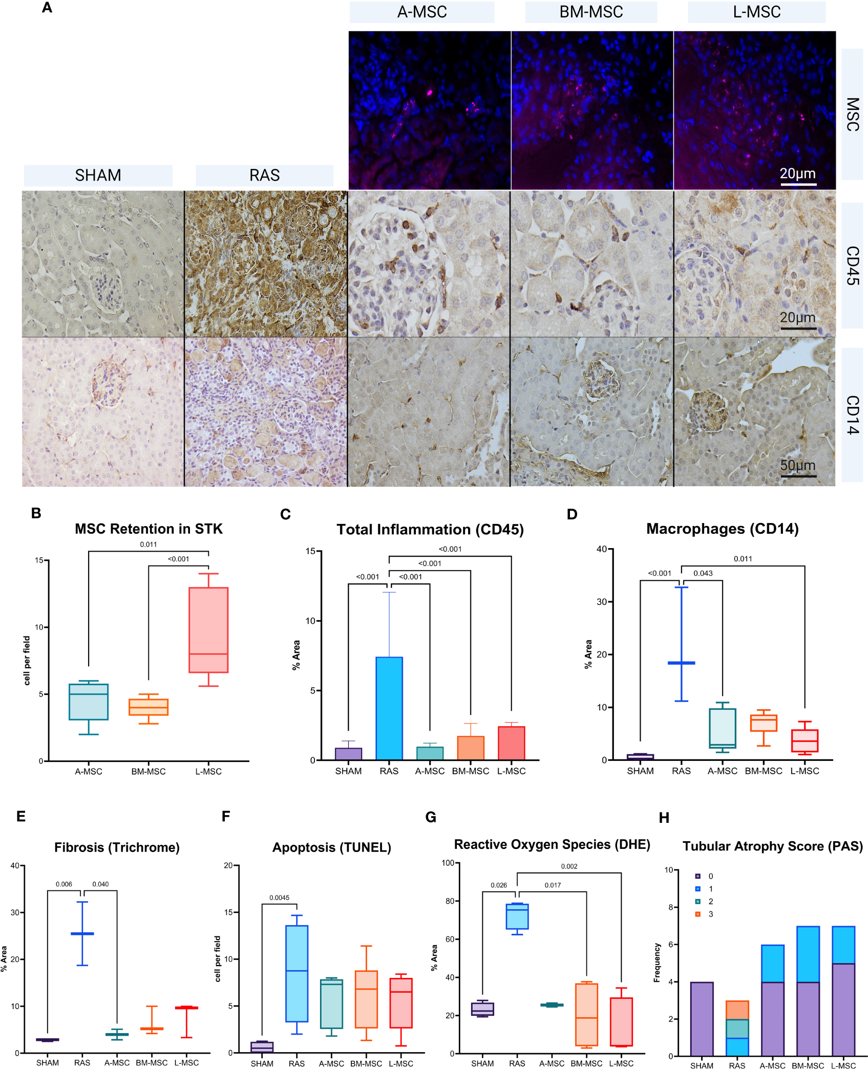 Representative histological images of MSC retention, CD45 stain, and CD14 stain. MSCs are labeled in pink. Positive staining for either CD45 or CD14 are in brown (A). Manual counts (median ± IQR) of retained MSCs and TUNEL+ cells per high power field (40x) and percent area of positive stain for CD45 (mean ± SD), CD14 (median ± IQR), Trichrome (median ± IQR), DHE (median ± IQR), and PAS (counts in each score) in the STKs within each group are shown in (B–H). MSC, mesenchymal stromal cells; TUNEL, Terminal deoxynucleotidyl transferase dUTP nick end labeling; DHE, Dihydroethidium; PAS, Periodic acid-Schiff.