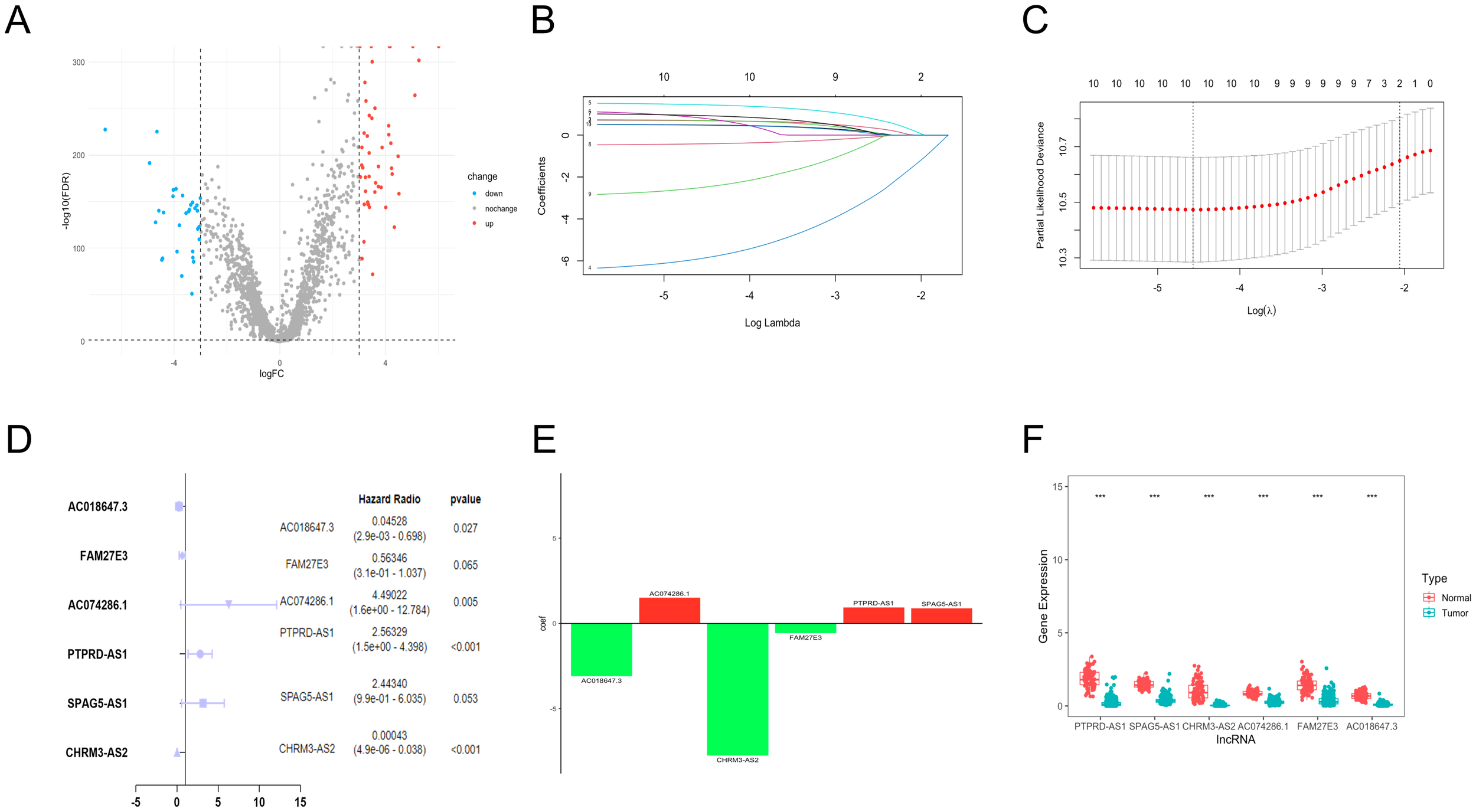 Establishment of TRLs prognostic model in OC. (A) The differentially expressed TRGs between normal and OC samples. (B) The distribution of lambda values in LASSO analysis. (C) The deviance diagram of LASSO analysis. (D) The six prognostic TRLs by multivariate analysis. (E) The coefficient distributions of six prognostic TRLs. (F) The expression of six prognostic TRLs between normal and OC tissues. *** P < 0.001.