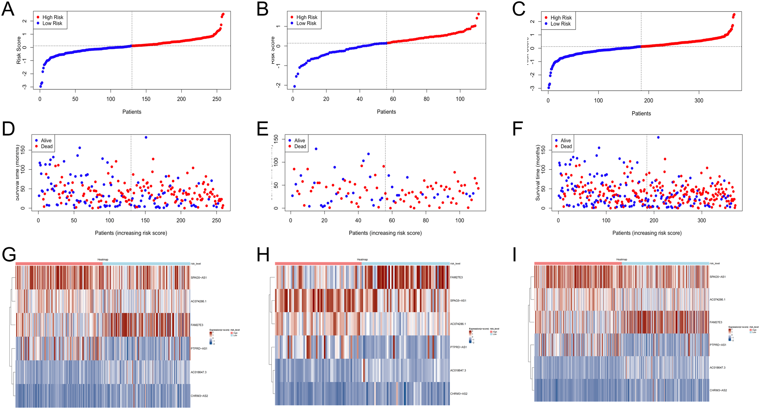 Verification of prognostic model in the training, testing, and overall sets. (A–C) The risk scores. (D–F) The survival status. (G–I) Heatmaps of 6 TRLs expression.