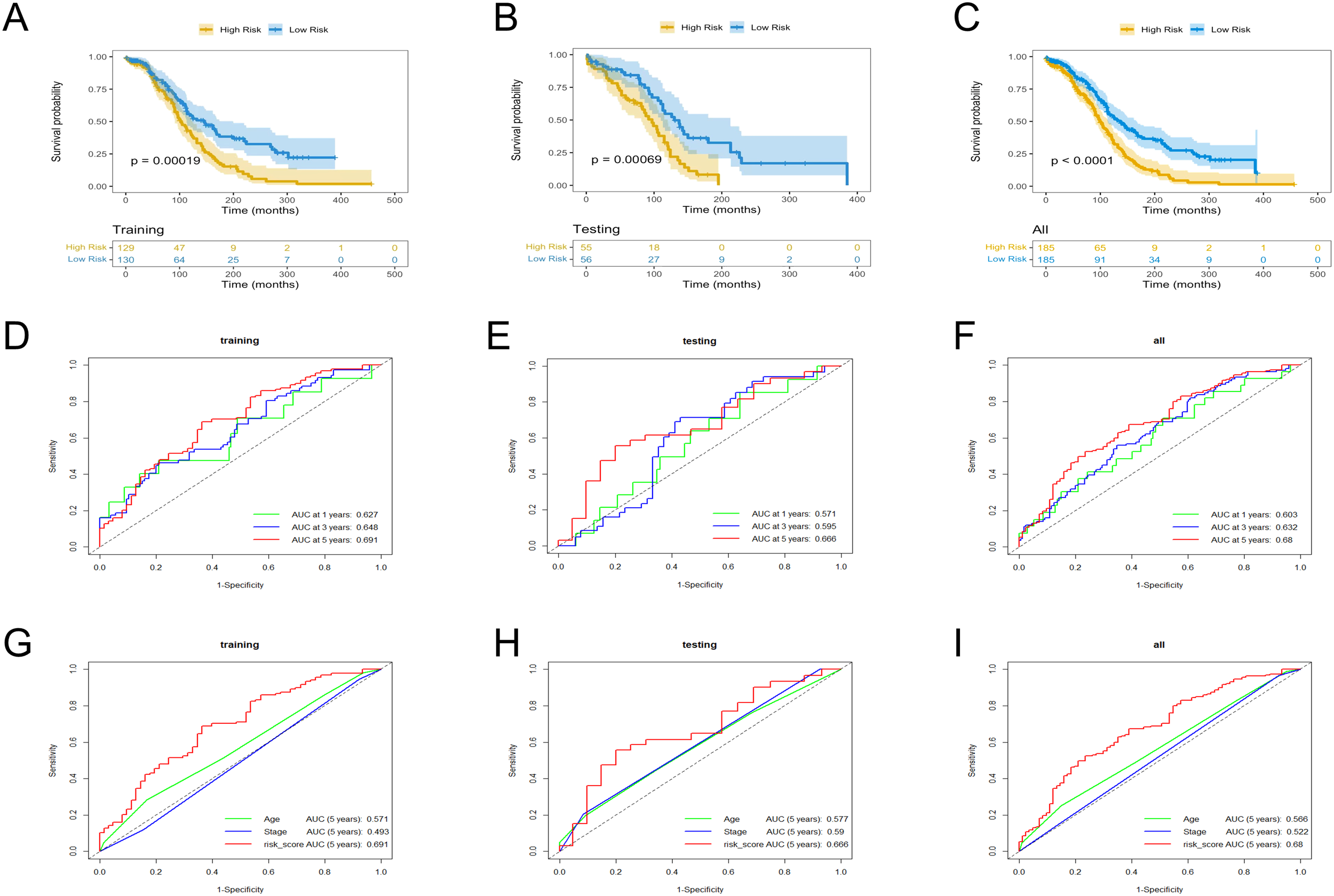 KM and ROC curves analysis in the training, testing, and overall sets. (A–C) OS rates. (D–F) ROC curves for the prognostic model. (G–I) ROC curves for the six TRLs risk scores and clinical factors.