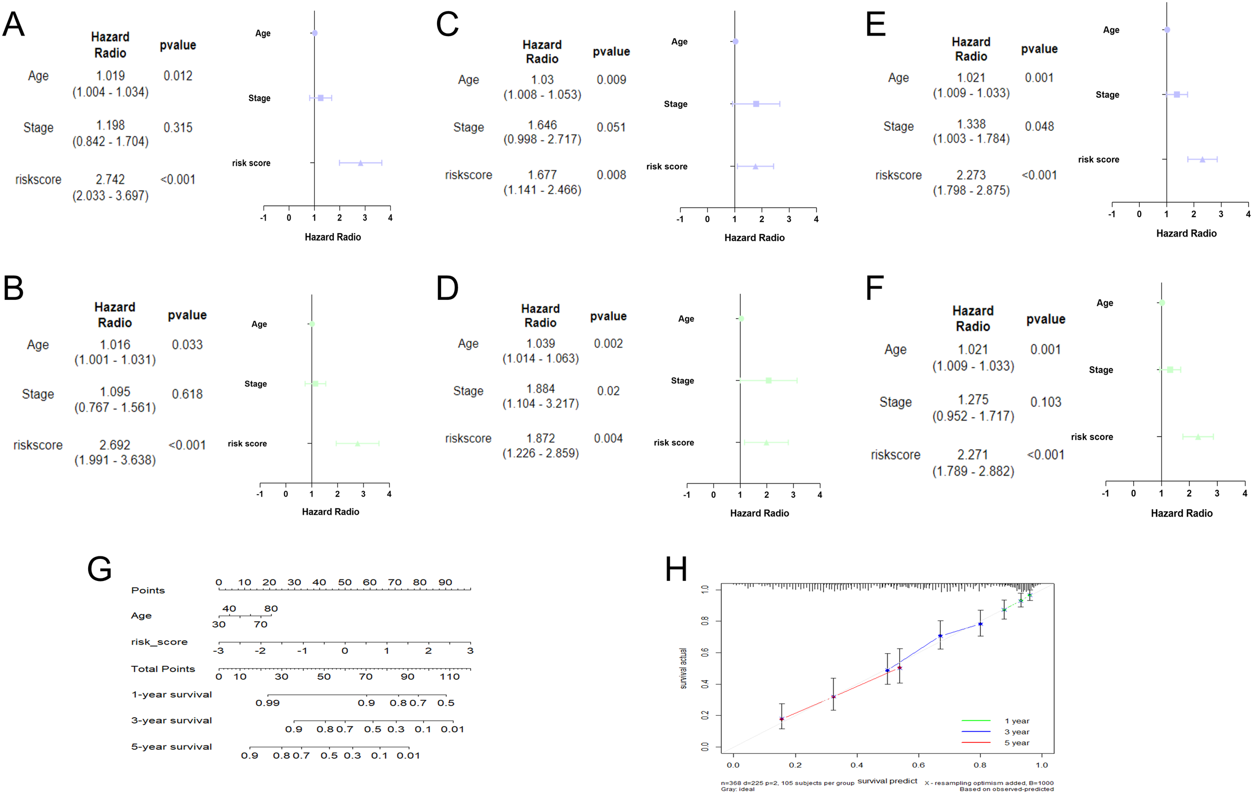 Establishment of nomogram. Univariate and multivariate analysis in the training (A, B), testing (C, D), and overall (E, F) sets. (G) Nomogram analysis in OC patients. (H) The calibration curves of the nomogram.