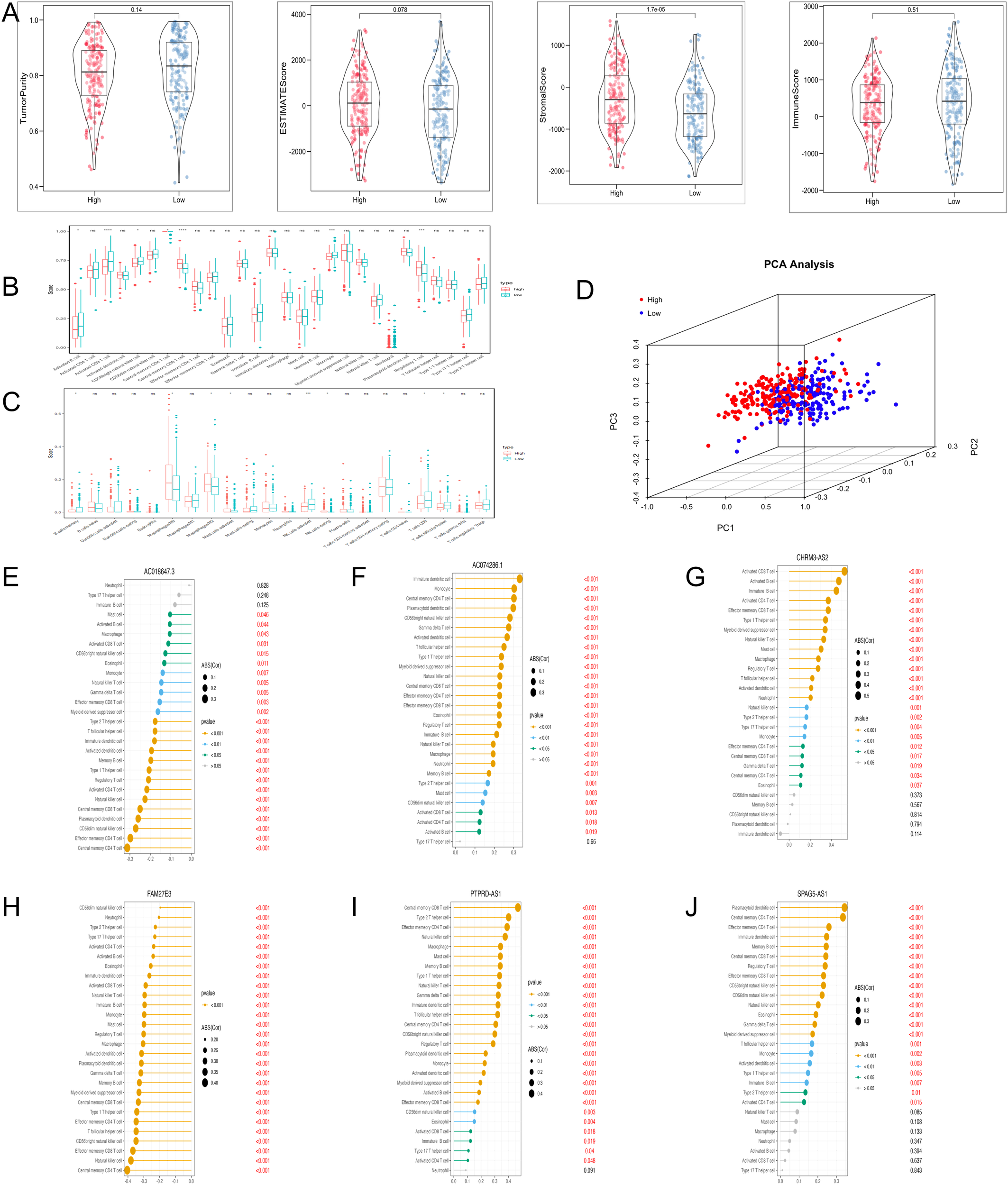 Immune cell infiltration analysis with TRLs risk group. (A) The ESTIMATE score, Immune score, and Stromal score diagrams. (B) The 28 type immune cells in two risk groups by ssGSEA. (C) The level of 22 immune cell infiltration in two risk groups by the CIBERSORT algorithm. (D) PCA analysis of immune cells between two groups. (E–J) Correlation analysis of six prognostic biomarkers (PTPRD-AS1, SPAG5-AS1, CHRM3-AS2, AC074286.1, FAM27E3, and AC018647.3) and immune cells. * P < 0.05, ** P < 0.01, **** P < 0.0001, ns, not significant.