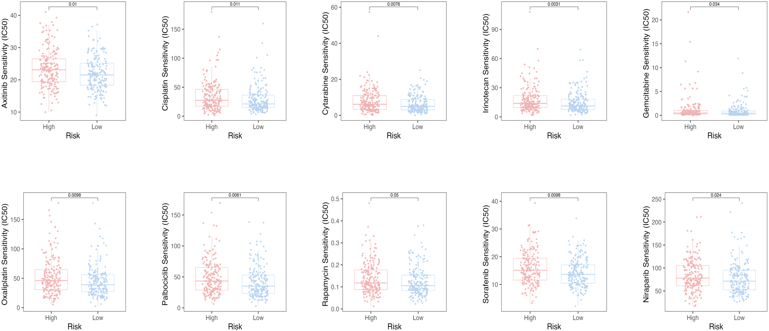 The “oncoPredict” package was employed to forecast drugs IC50 values. The IC50, indicative of tolerance capacity, was computed, with higher IC50 values signifying increased resistance of cells to the drugs. Subsequently, the disparity in sensitivity scores between the two groups was analyzed.