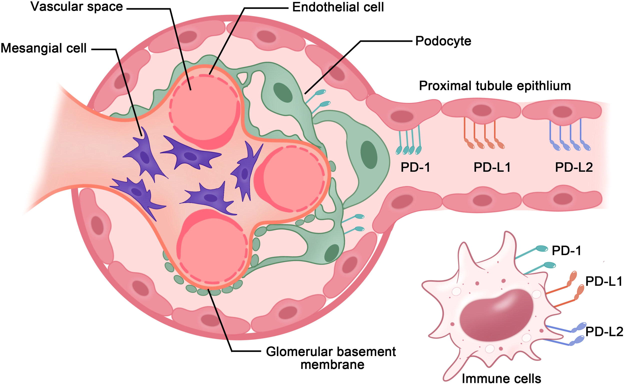 PD-1 axis in immune cells and renal parenchymal cells. PD-1 receptors and ligands on resident innate immune cells in the renal interstitium and renal parenchymal cells, including renal proximal tubule epithelial cells and podocytes, aid in maintaining immunological homeostasis within the kidneys.