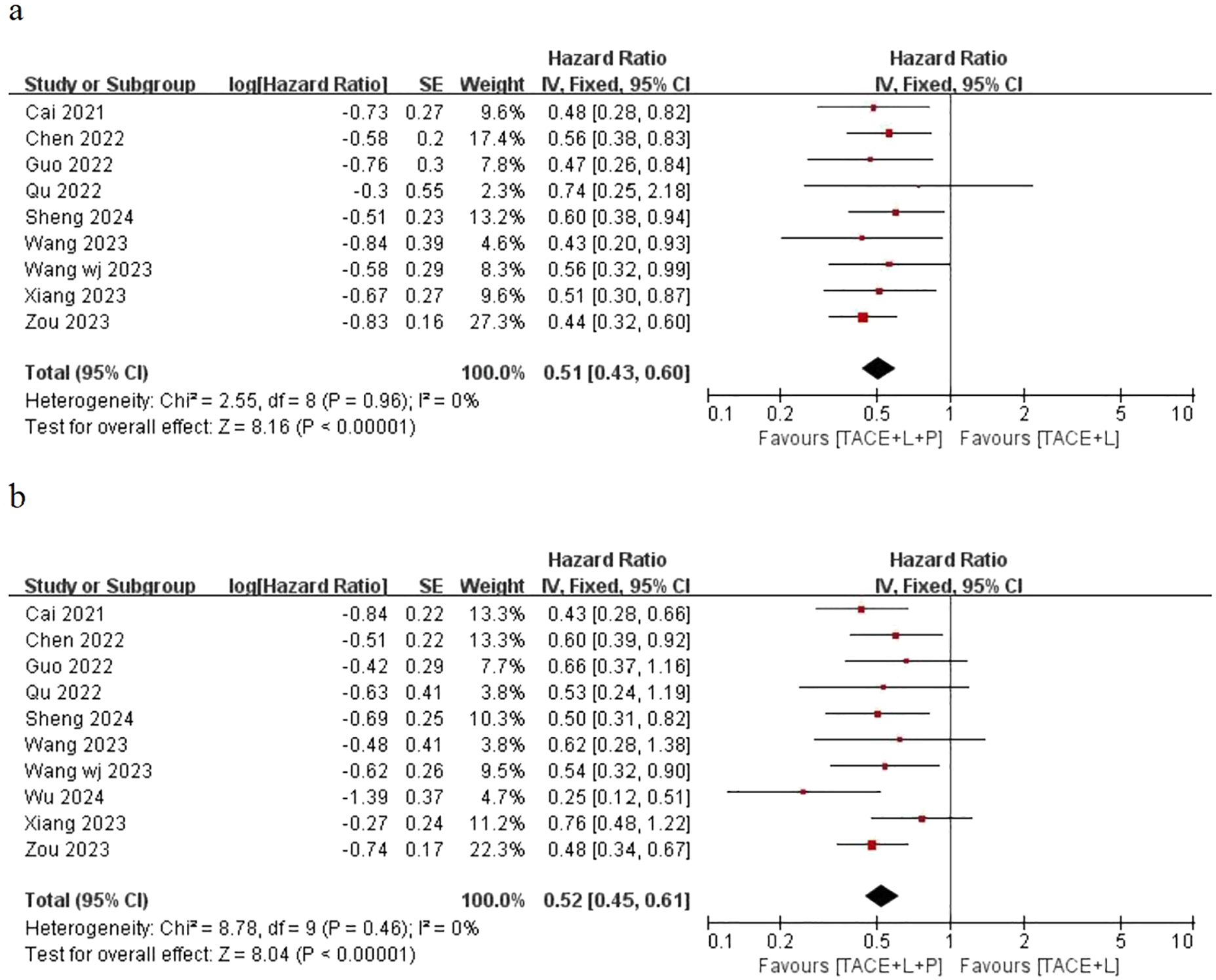 Only nine articles provided the outcomes of OS and 10 articles provided the outcomes of PFS for the two groups, including the point estimate (HR) and its 95% CI. The meta-analysis indicated that patients with uHCC in the TLP group had significantly longer OS (HR=0.51; 95% CI: 0.43–0.60, P < 0.05) and PFS (HR=0.52; 95% CI: 0.45–0.61, P < 0.05) than those in the TL group. The findings indicated that the TLP triple therapy could significantly prolonged survival time (Figure 2).