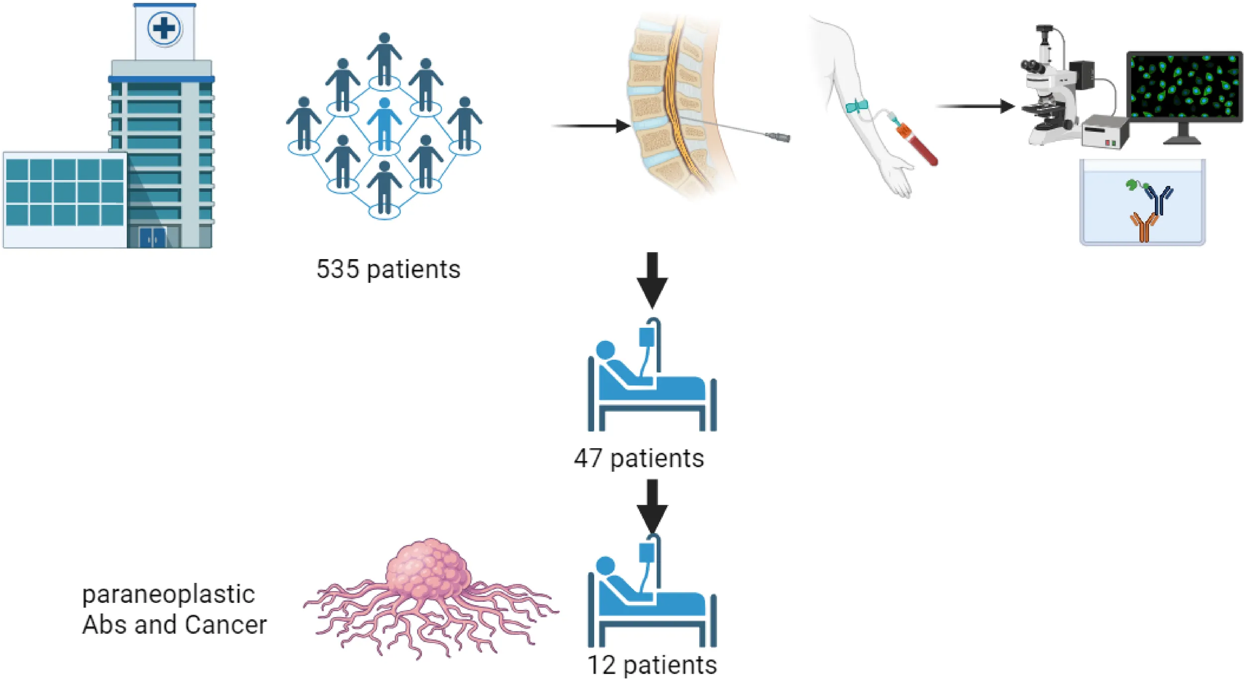 patients (n=535) underwent serum or CSF onconeural antibody panel testing at Rambam Health center between 1/11/2016-6/3/2023. We excluded 488 due to negative antibody test results. 47 patients had non-negative antibody test results included “suspected-positive” and “low-positive” results. 35 excluded due to lack of cancer diagnosis or recognizable PNS phenotype. 12 patients eventually developed cancer and exhibited a recognizable PNS phenotype.