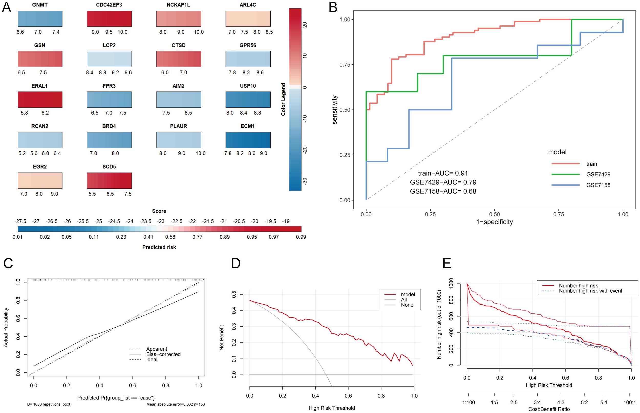 Construction and evaluation of the nomogram model. (A) Nomogram prediction model. The color legend on the right represents the score of each gene, adding up each gene’s score to get the Score below and the Predicted risk of OP. (B) ROC curves of the nomogram model in various datasets. (C) Calibration curve. The X-axis represents predicted probability, and the Y-axis represents actual outcomes. Apparent represents uncorrected model predictions. Bias-corrected represents model predictions after bootstrapping correction. Ideal represents absolute ideal model predictions. (D) DCA curve. The X-axis is the threshold probability for being judged as high-risk, and the Y-axis represents net benefit. All and None represent the extreme cases of all interventions and no interventions. (E) Clinical impact curve. The dual X-axis represents the threshold probability of being judged as high risk and the cost: benefit ratio. Number high risk represents the number of cases judged positive by the model, Number high risk with event represents the number of true positives.