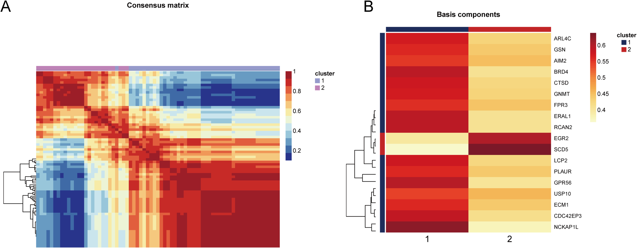 Heatmap showing the distinction between cluster1 and cluster2. (A) The consensus matrix of NMF clustering. (B) The co-clustering coefficient of HRGs.