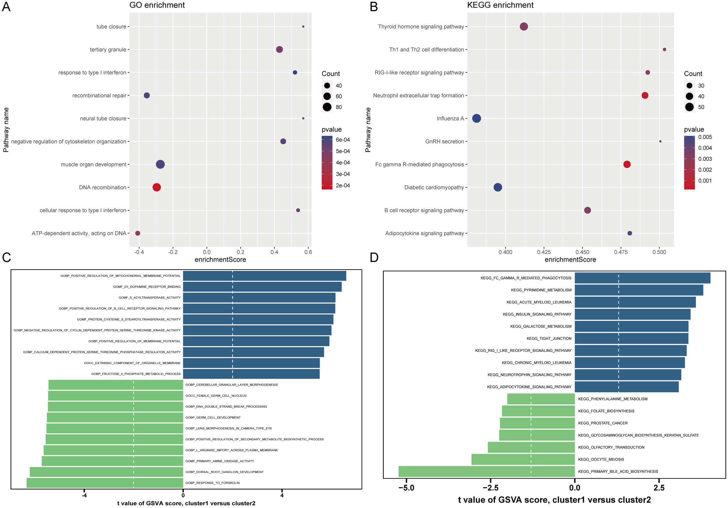 Results of GO and KEGG enrichment analysis. (A, B) GSEA results of GO and KEGG. The X-axis represents enrichment score. The Y-axis represents pathway names. Count represents the number of genes. (C, D) GSVA results of GO and KEGG. The X-axis is the t-value. The Y-axis represents pathway names.