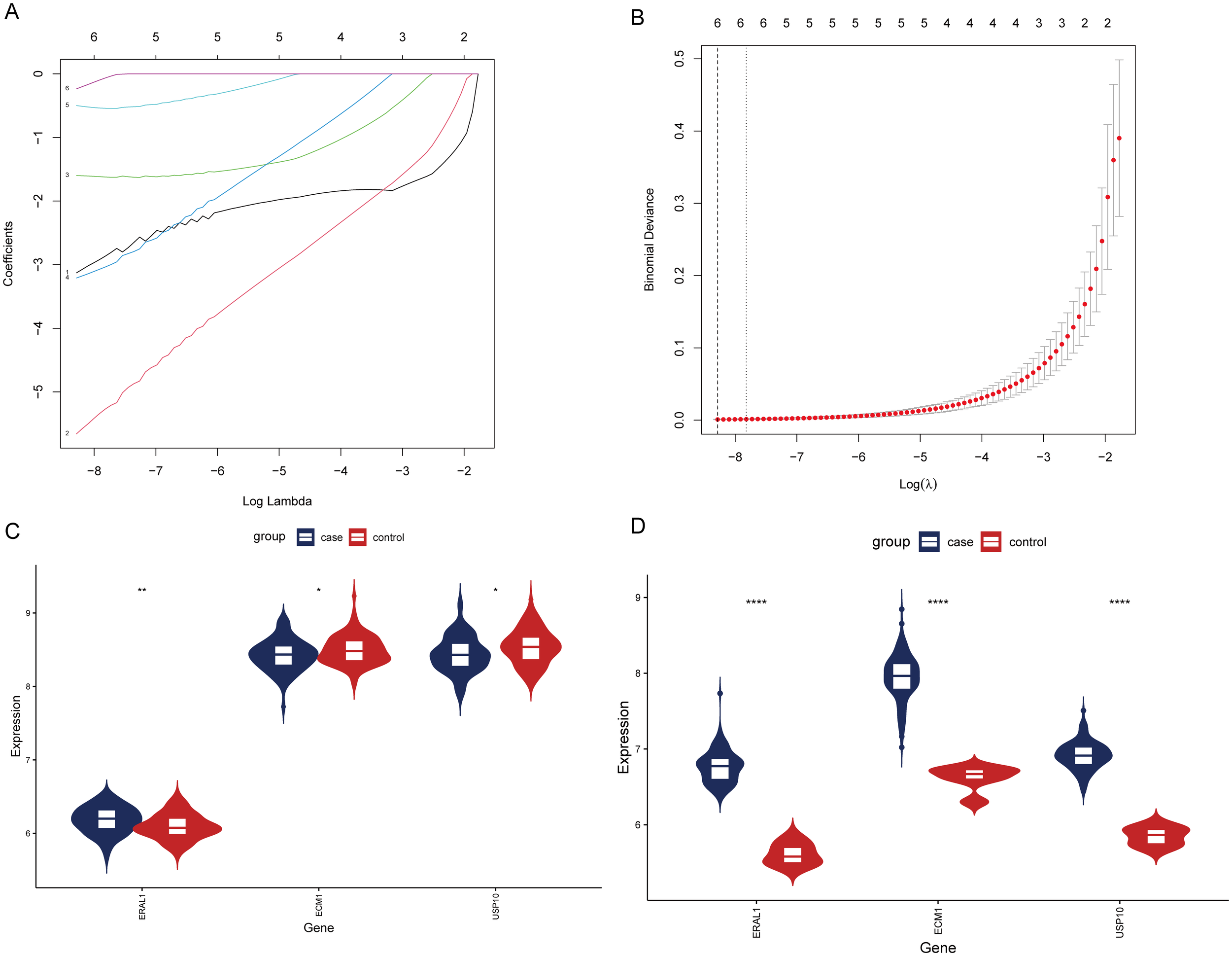 Screening of HRGs and expression of HRGs in the dataset. (A) Coefficients of each gene as the penalty parameter lambda varies. (B) Ten-fold cross-validation graph. (C) Expression of HRGs in the OP dataset. (D) Expression of HRGs in the HBV dataset. *P < 0.05, **P < 0.01, ****P < 0.0001.