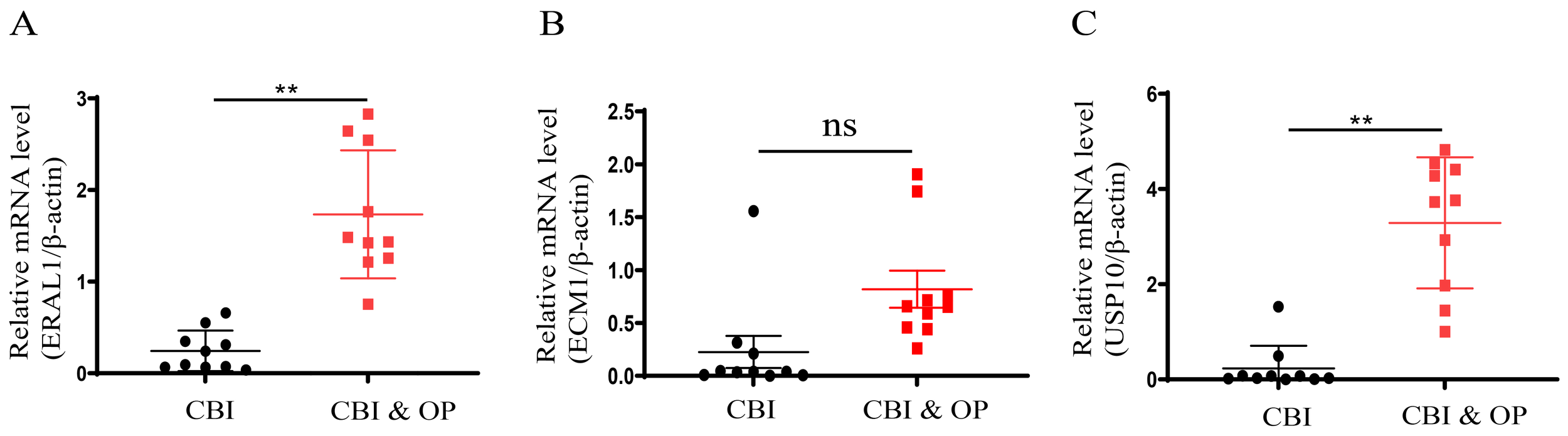 Expression of the three hub genes in CBI and CBI combined OP was detected by RT-qPCR. (A) ERAL1. (B) ECM1. (C) USP10. ns represents P ≥ 0.05, **P < 0.01.