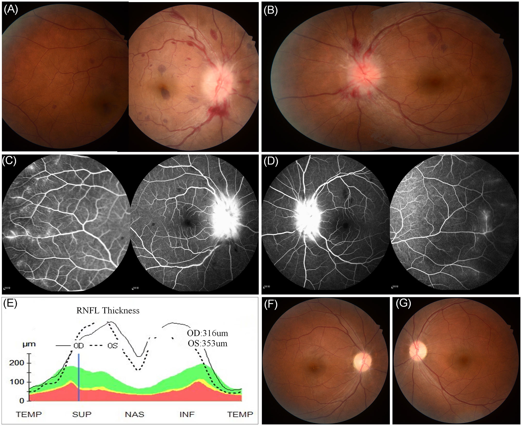 Figure 1. Fundus examination revealed the presence of binocular peripapillary and perivascular haemorrhages as well as extensive deep retinal haemorrhages with severe optic disc swelling greater in the right eye (A) than in the left (B). (C, D) Fluorescein angiography images showed leakages of the bilateral optic disc and peripheral capillaries. (E) Retinal nerve fiber layer thickening on optical coherence tomography. (F, G) Retinal photos 1 month after onset showing the retinal haemorrhages in the binocular region had been absorbed completely.