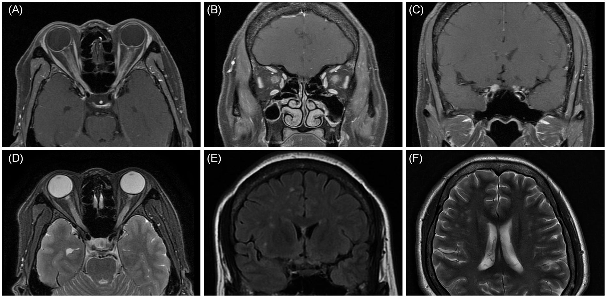 Figure 2. MRI axial (A) and coronal (B, C) showed bilateral enhancement of the optic nerve sheath, optic nerve, and chiasm. (D) Fat-suppressed T2-weighted sequences showed a hypersignal of the bilateral optic nerves and sheath. (E, F) Coronal and axial MRI was found to have multifocal patchy lesions in white matter of frontal cortex and the periventricular white matter.
