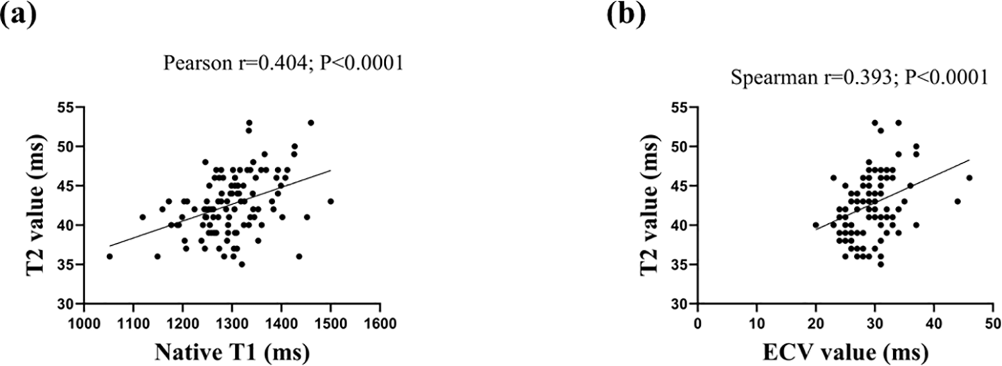 All data were analyzed using GraphPad Prism 7 (Version 7.00, GraphPad Software, Inc.) or SPSS (Version 23.0, Released 2015, IBM Corp). Continuous variables were tested using the D’Agostino and Pearson normality test and expressed as mean ± SD or median (interquartile range, Q25–75). Categorical data were expressed as numbers and percentages. The unpaired t-test, Mann-Whitney U test, or chi-square test were performed to compare the SLE patients and controls as appropriate. In addition, comparisons between three groups (SLE patients with PE, SLE patients without PE, and controls) were conducted using a one-way analysis of variance (ANOVA) or Kruskal-Wallis test on the clinical and CMR variables. Pearson’s correlation was performed to assess the relationship between T1, ECV, and T2 values. Univariable and multivariable linear regressions were used to identify independent factors of tissue characteristic parameters. Variables with P-values less than 0.10 in the univariate linear regression analysis were included in the multivariate linear regressions. A P-value less than 0.05 was considered significant.