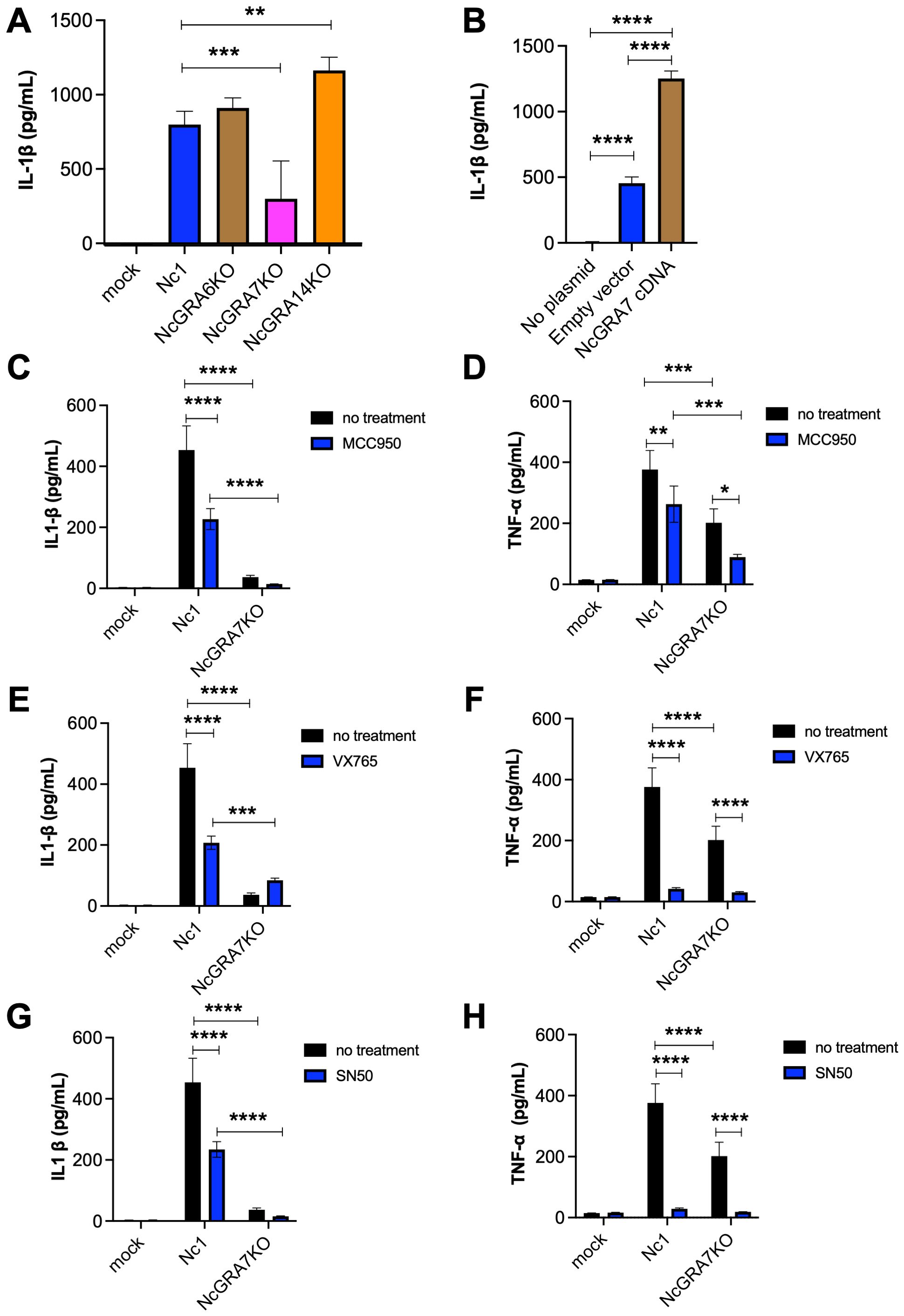 Figure 1. IL-1β and TNF-α production in THP-1 cells and inflammasome-reconstructed 293T cells. (A) THP-1 cells were infected with the parental strain Nc1 or the NcGRA6-, NcGRA7-, or NcGRA14-deficient (KO) parasites at a multiplicity of infection (MOI) of 2.5 or treated with medium only (mock). At 20 h postinfection, the culture supernatants were collected for analysis. (B) 293T cells were transfected with inflammasome-reconstruction plasmids encoding NLRP3, ASC, procaspase-1, and pro-IL-1β, together with NcGRA7 cDNA or an empty vector. Untransfected 293T cells were used as a negative control (no plasmid). At 20 h posttransfection, the culture supernatants were collected for analysis. (C–H) THP-1 cells were pretreated with 10 μM MCC950 (an NLARP3 inhibitor), 100 μM VX765 (a CASP1 inhibitor), and 18 μM SN50 (an NF-κB inhibitor) for 2 hr and then infected with the Nc1 strain of N. caninum at a MOI of 2.5 or treated with medium only (mock). At 20 h postinfection, the culture supernatants were collected for analysis. Each value represents the mean ± SD of 4 replicates (technical replicates) in one representative experiment. Each experiment (biological replicate) was repeated two (G, H), three (A, D, E, F) and four times (B, C). Statistically significant differences according to one-way ANOVA or two-way ANOVA and a Tukey–Kramer post hoc analysis (* P < 0.05, ** P < 0.01, *** P < 0.001, **** P < 0.0001).