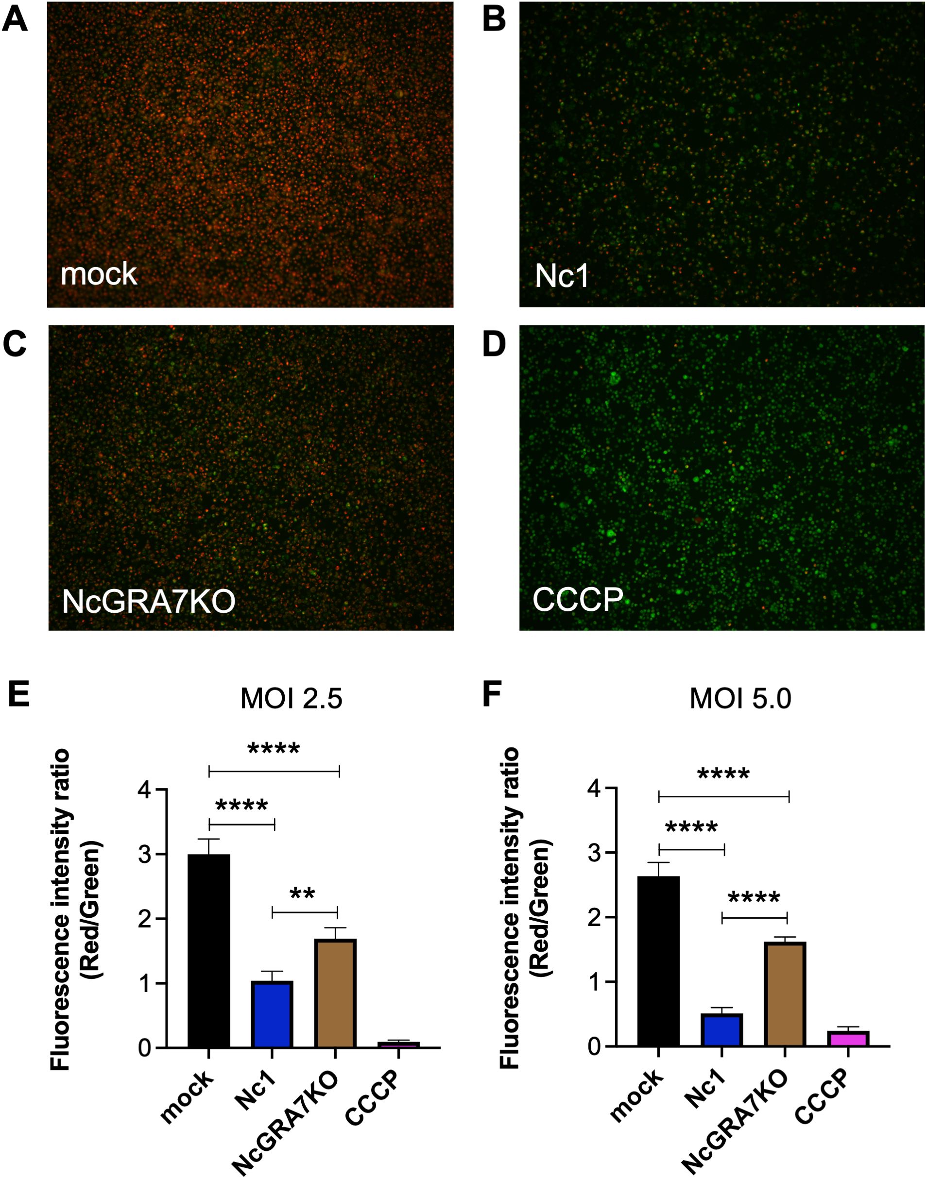 Figure 2. Quantification of the mitochondrial membrane potential (∆Ψm) in THP-1 cells. THP-1 cells were infected with mock (A), the parental strain Nc1 (B), NcGRA7-deficient (KO) parasites (C) at a multiplicity of infection (MOI) of 2.5 or treated with 100 μM CCCP (D). At 20 h postinfection, the ∆Ψm in cells was measured using JC-1 staining, which allows a reduction in the red/green ratio (indicating depolarization) (E). Each value represents the mean ± SD of 4 replicates (technical replicates) in one representative experiment. Each experiment (biological similar replicate) was repeated two times. (F) Results at a MOI of 5.0 are shown. Each value represents the mean ± SD of 4 replicates (technical replicates) in one representative experiment. Statistically significant differences according to one-way ANOVA or two-way ANOVA and a Tukey–Kramer post hoc analysis (** P < 0.01, **** P < 0.0001).