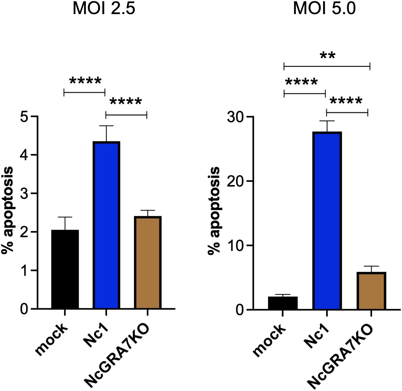 Figure 3. Quantification of THP-1 cell apoptosis. THP-1 cells were infected with mock, the parental strain Nc1, NcGRA7-deficient (KO) parasites at multiple infections (MOI) of 2.5 and 5.0. At 20 h postinfection, early apoptosis was measured using PE-conjugated Annexin V and 7-AAD. Each value represents the mean ± SD of 4 replicates (technical replicates) in one representative experiment. Each experiment (biological replicate) was repeated one (MOI of 2.5), two (MOI of 5) times. Statistically significant differences according to one-way ANOVA or two-way ANOVA and a Tukey–Kramer post hoc analysis (** P < 0.01, **** P < 0.0001).