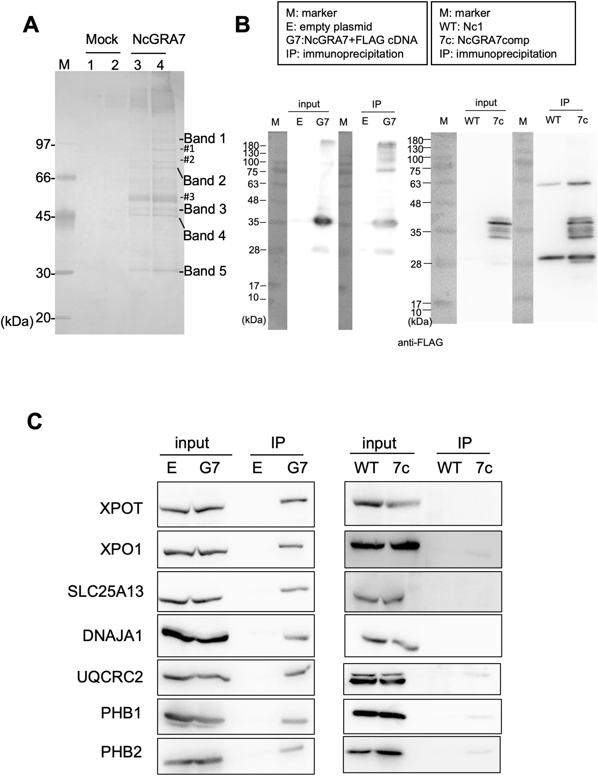 Figure 4. Characterization of NcGA7-binding proteins. (A) Silver staining for SDS–PAGE to identify NcGRA7-binding proteins by an anti-FLAG immunoprecipitation assay using 293T cells transfected with empty plasmid (Mock, Lanes 1 and 2) or NcGRA7 cDNA fused with a FLAG tag (Lanes 3 and 4). Enriched or exclusively detected proteins are shown as five bands, while the other three bands (#1, #2 and #3) were excluded from the MS analyses. M: molecular marker. Each experiment (biological replicate) was repeated two times. (B, C) Western blots of the fractions eluted from the anti-FLAG immunoprecipitate were analyzed by immunoblotting using antibodies against FLAG (B), XPOT, XPO1, SLC25A13, DNAJA1, UQCRC2, PHB1, and PHB2 (C). 293T cells transfected with empty plasmid (E) or NcGRA7 cDNA fused with a FLAG tag (G7) at 20 h posttransfection and HFFs infected with the parental strain Nc1 of N. caninum (WT) and NcGRA7-complemented (7c) parasites at 40 h postinfection were used. Each experiment (similar biological replicate) was repeated two time (B, C).